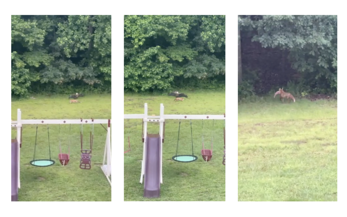 Casey Holland, a mortgage loan officer from Earlville, Maryland, woke up to a wild show on the morning of June 7. Just behind his kids’ swing set, a red fox and a bald eagle were squaring off for dibs on a pile of fish that Holland had caught and cleaned the night before. He grabbed his phone and started to record as the two predators circled each other in a tense backyard standoff.