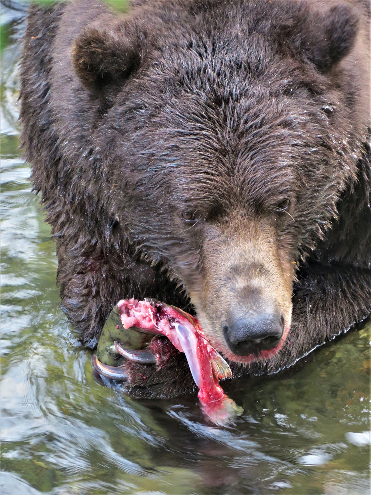 In 2002, the brown bear project leader biologist Jack Whitman, agreed to help a National Geographic film crew try to fit a brown bear with the first crittercam, which would show audiences the world from the bear’s perspective. Beier was on Chichagof Island working with another biologist and they started snaring bears a few weeks before the crew showed up. They had caught and processed around 20 animals when they moved to Kennel Creek to set a few snares. There were some salmon around but the main run hadn’t arrived. The following morning, when the men returned to check their sets they saw a motionless bear caught in the first snare. It’s not unusual for bears to fall asleep in a snare, but after studying the animal with binoculars they noticed flies and then blood. They found the bear dead from bites to its head, lying on its back, its genital area torn up from another bear.