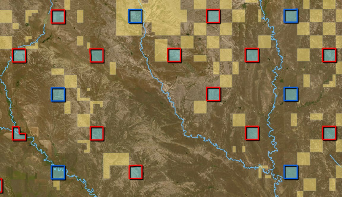 On the DNRC’s map, accessible state lands are bordered in blue while inaccessible lands are bordered in red. While red squares can be found in all areas of the state, they predominate in central and southeastern Montana, where large ranches often surround state sections, which are often leased to adjacent property owners for livestock grazing or farming. The onX/TRCP report noted that across the West, some 6.35 million acres of state lands are “landlocked” and have no permanent legal access.