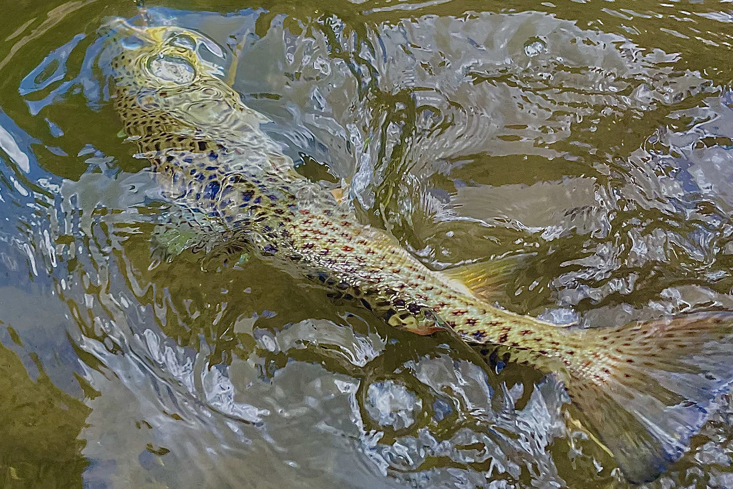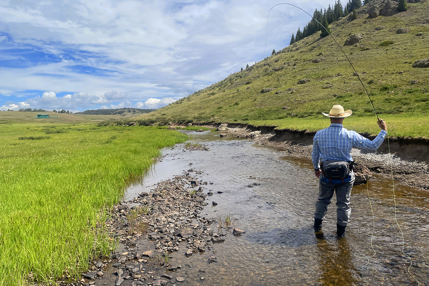 Kerkmans and I are in the high country of northern New Mexico on a remote, upper fork of an anonymous river. It’s narrow enough to spit across and shallow enough to wade the deepest holes without getting your shirt wet. It’s also loaded with fish. We can see the little brookies pushing wakes in the shallows and rising underneath grassy cutbanks. Between the two of us, we’ve caught and released at least 60 in the last couple of hours.
