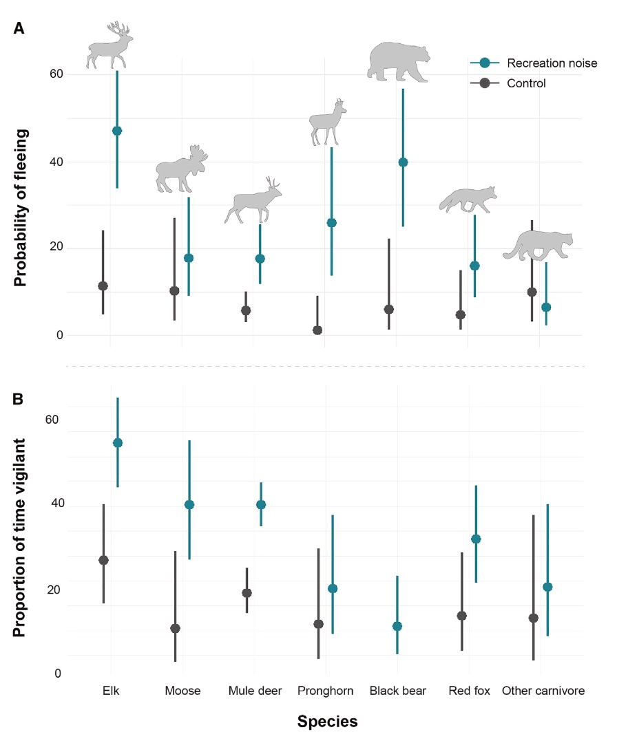 Out of the animals studied, elk proved the most sensitive to human recreation sounds and had a nearly 50 percent probability of fleeing; they also stayed vigilant the longest after running off. Black bears were the second-most likely to flee at about 40 percent probability, followed by pronghorn at 25 percent. Moose, mule deer, and coyotes all registered roughly the same, at below 20 percent.