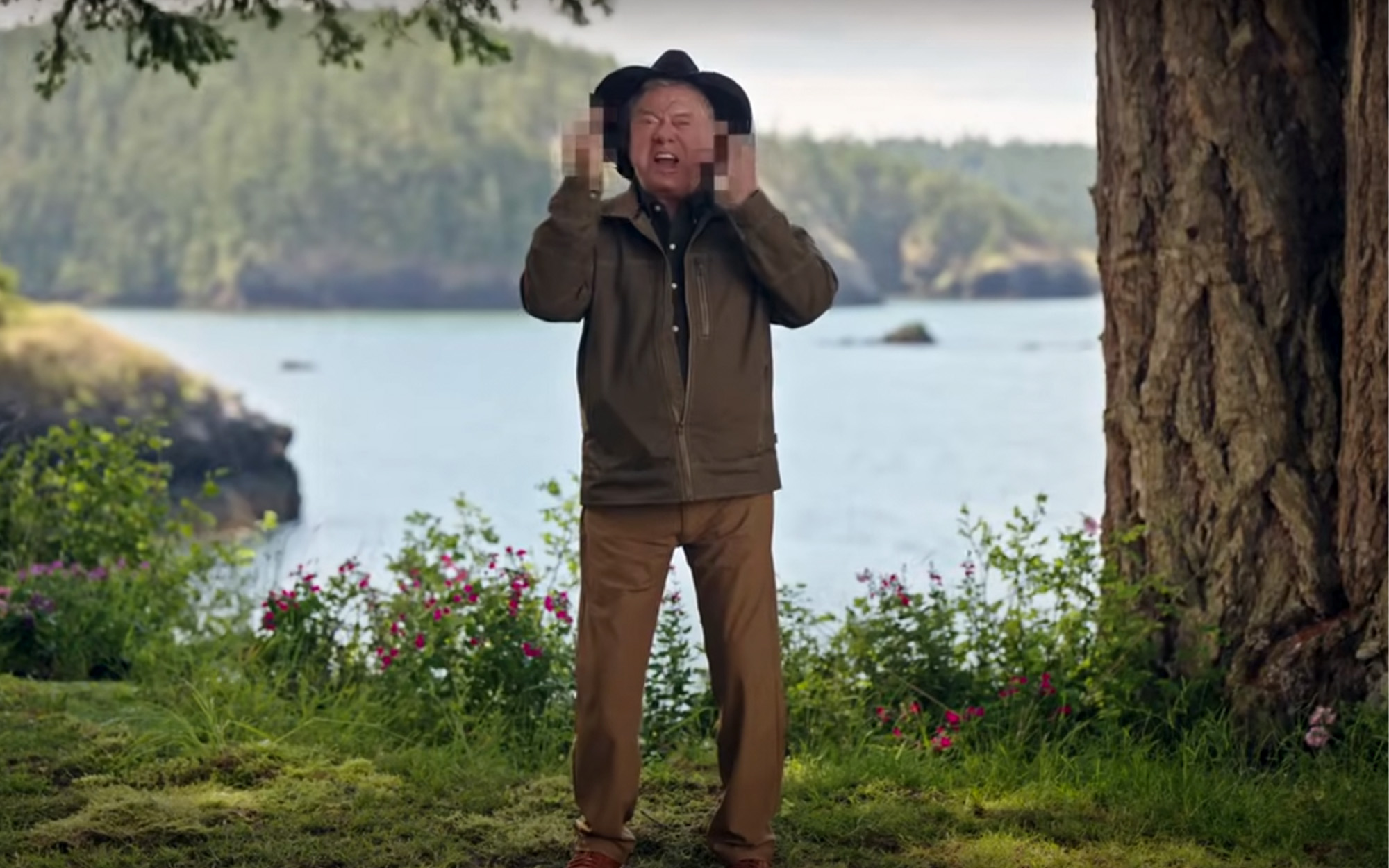 Shatner then calls on other Canadians to do the same, and he cheers on their creatively-worded insults. Hockey legend and Ontario native Kirk McClain is featured in the ad, as is a roaring black bear. At one point in the video, a baby in a stroller even gives salmon farmers the finger.
