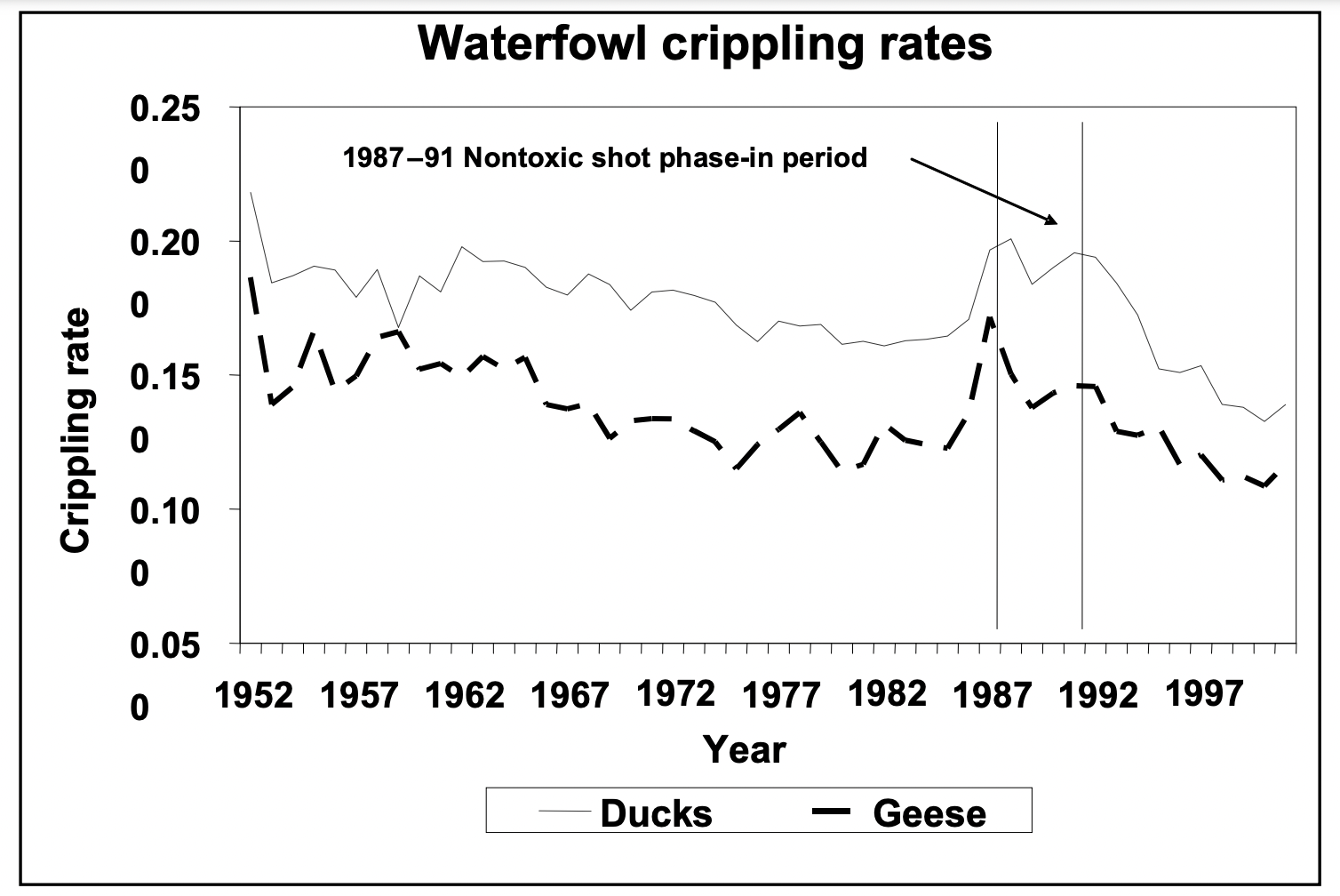 The chart they produced shows a decline in crippling rates in recent years, unfortunately that decline is likely due to changes in HIP survey data (not actual changes in the field), according to the report.