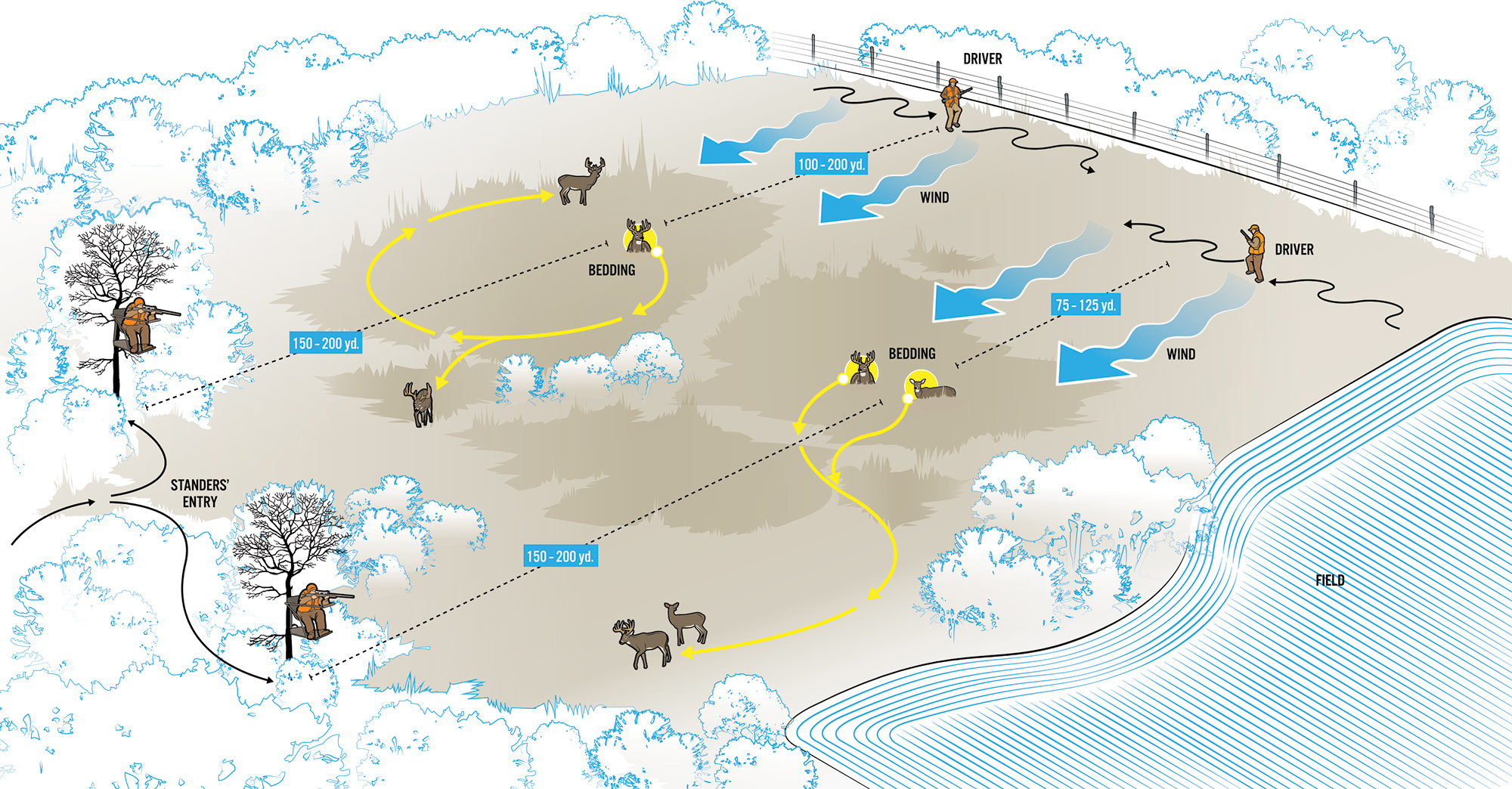 If you intend to do your own drive, learn from the mistakes of others. On the opener, a small group (see illustration at right) can produce better results than a big one. With so many hunters out, the goal isn’t to push deer but rather to nudge them into positions you can take advantage of. Start with a small group—three to five hunters—and position a pair of standers on the downwind side of cover at least an hour before the drivers begin to work.