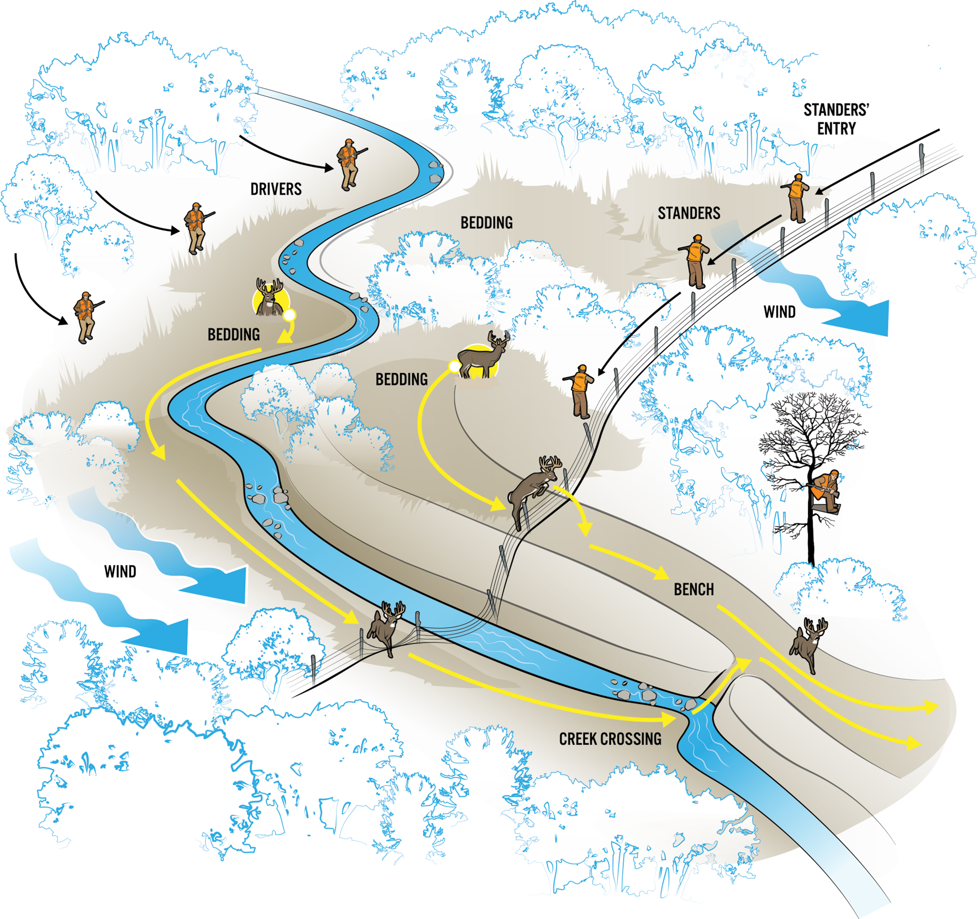 Once standers are in place, drivers drift along the upwind sides of deer-holding cover, moving slowly and quietly. The goal is to allow scent to sift into the cover, getting deer on their feet and sneaking away.