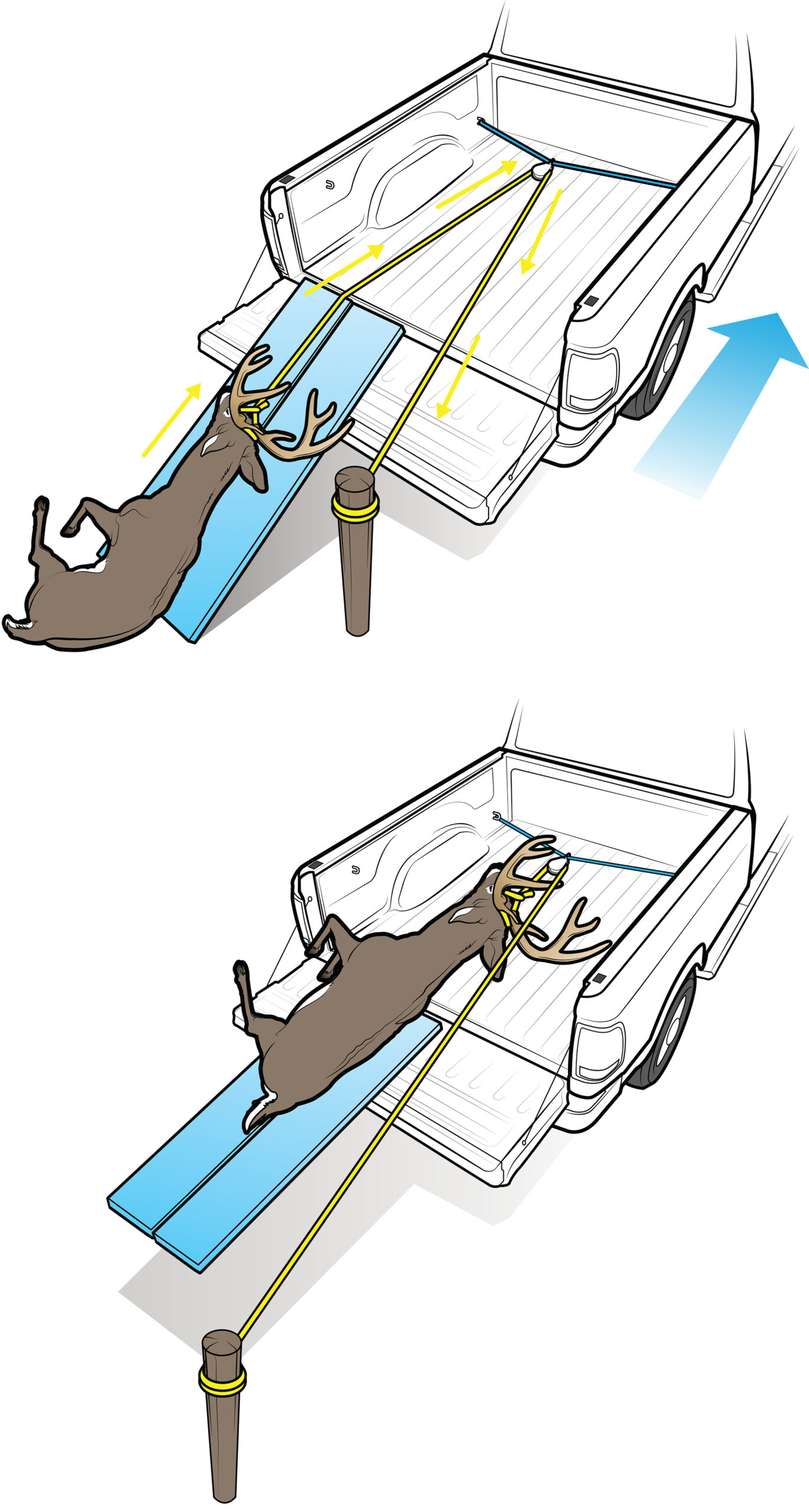 Now, run a rope through the pulley. Tie off one end on the deer (around the neck for does, antlers for bucks) and the other end around a stout tree or fence post. With the planks, create a ramp from the tailgate to the ground and position the deer so that it will slide up the ramp and into the truck. That’s it. Put the truck in gear and slowly pull forward. The deer will slide into the bed of the truck and you’ll have conquered the task without having to call in a single favor.