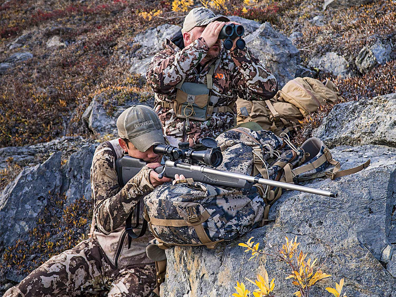 We get about halfway down the mountain and nestle into a big rock outcropping to catch our breath and relocate the caribou. Now that we’re out of sight, the bulls have seemingly forgotten about us. They’re still walking the edge of the draw, but they stop to feed and rake brush with their antlers as they go. I watch the white bull closely, this time through the riflescope.
