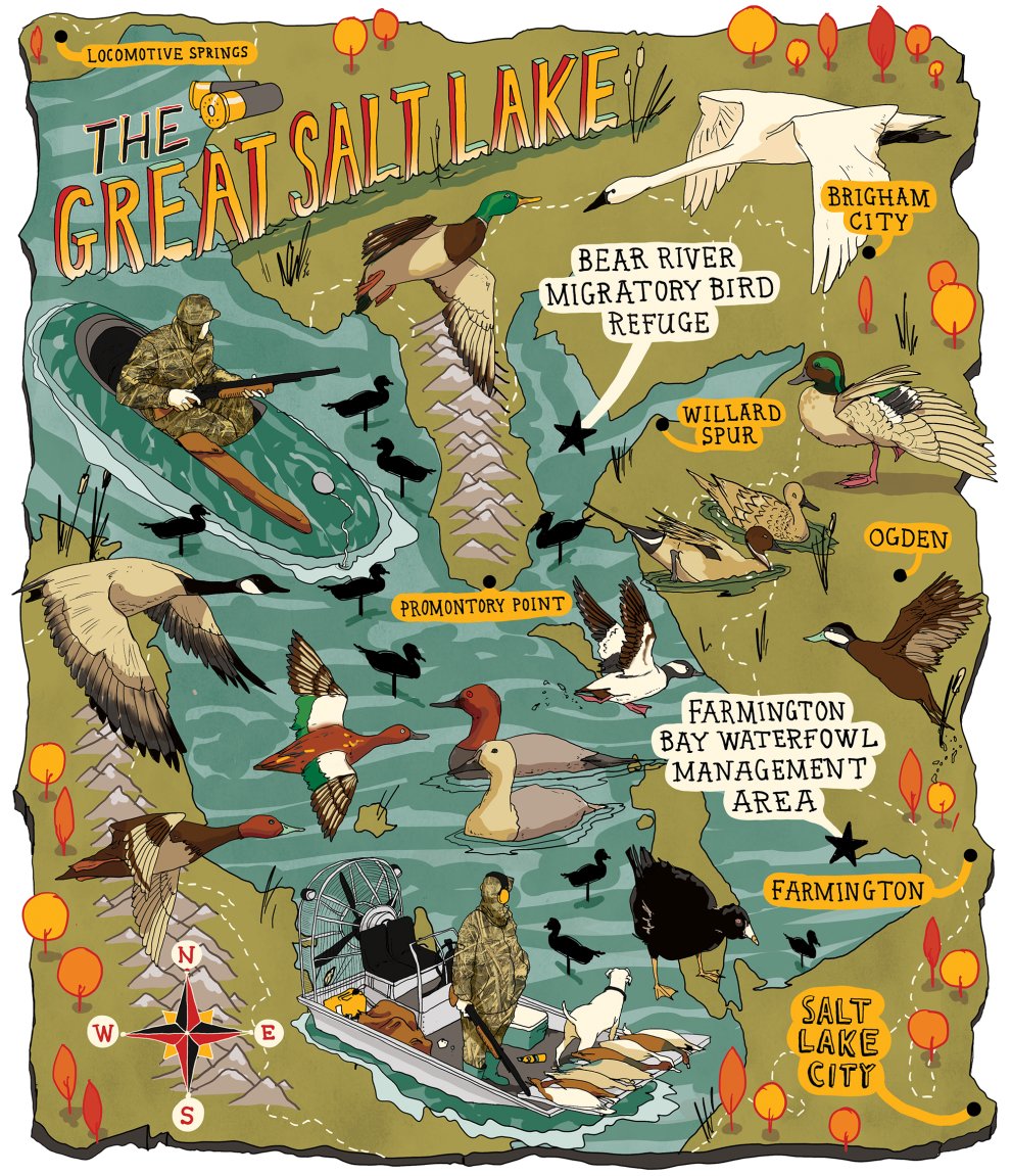 The appeal of the 75-mile-long Great Salt Lake is almost as powerful for waterfowl hunters as it is for birds. The lake has good public access, habitat that enables a wide variety of hunting styles, and extensive marshland that attracts a diversity of waterfowl species unrivaled elsewhere in the flyway—and probably the continent.