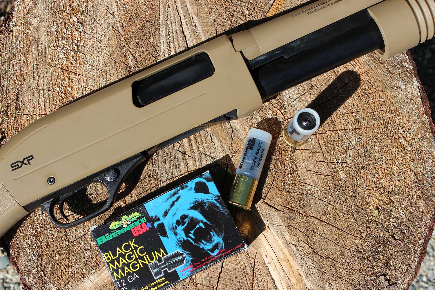 For a bear defense shotgun, go with an 18-inch barrel and a reliable pump action. The Remington 870, Mossberg 500, and Winchester SXP are all offered in versions with shorter barrels and extended magazines. Buy premium magnum slugs like the Brenneke Black Magic, and forget about the new birds-head grip short shotguns.