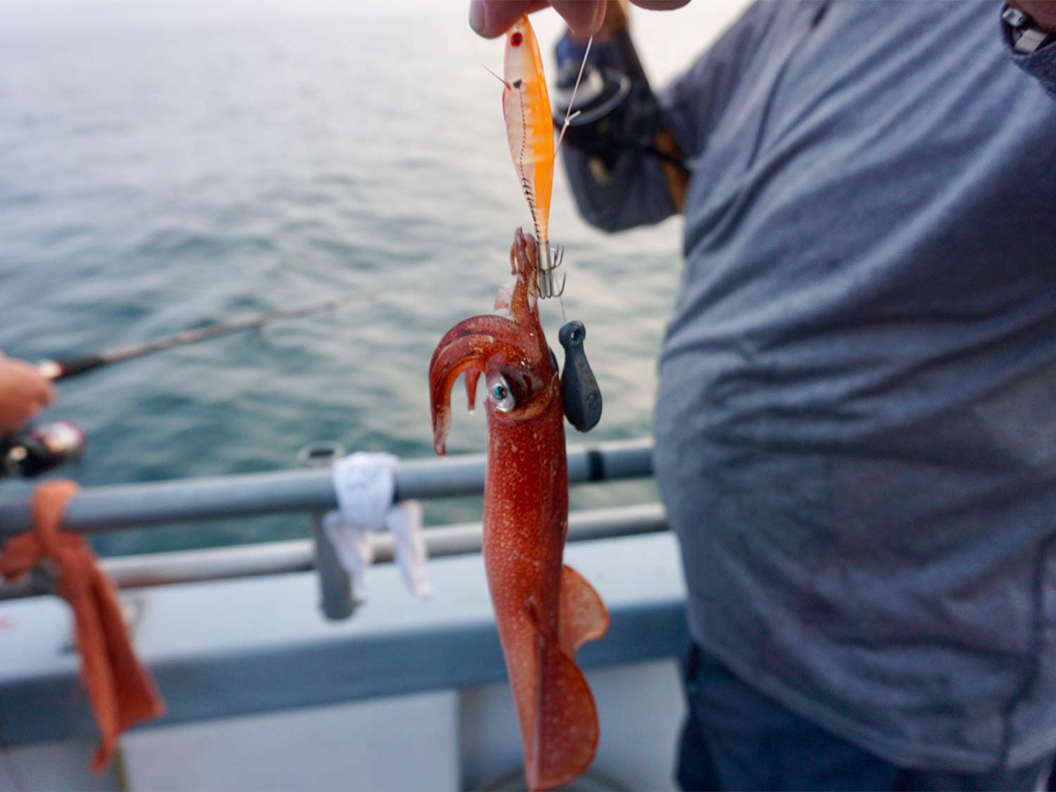 The trouble is, it’s hard to feel when a squid is on the hook. You’re jerking the rod tip up and down with a lot of hardware on the other end, and sometimes the jigs and sinker feel like a strike. I asked Amy what to look out for. “They kind of feel like a wet sock on the end of your line,” she said. “You really have to pay attention if you want to set the hook. Also, make sure you don’t reel in too hard otherwise you’ll pull off their tentacles.”
