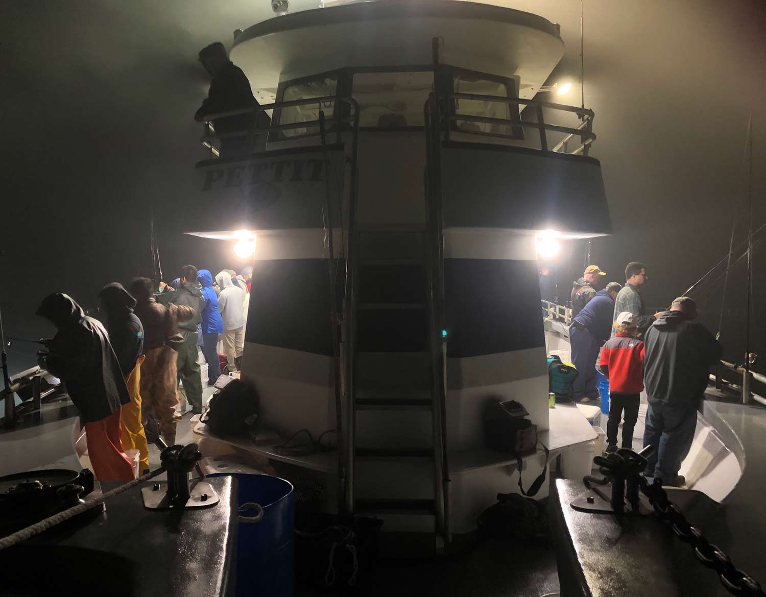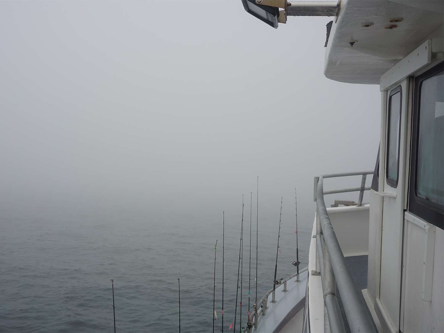 Visibility was next to nothing when we pulled out of the dock. A thick fog had rolled in, and it didn’t look like it was getting better anytime soon. I had just made it onto the boat by 6:00 p.m., and while most other sailors were out struggling to find their way home that evening, Captain Dubrule was making his way into the Long Island Sound with a full load of customers. I stood on the bridge with the captain and listened as he gave me the lowdown on jigging for squid.