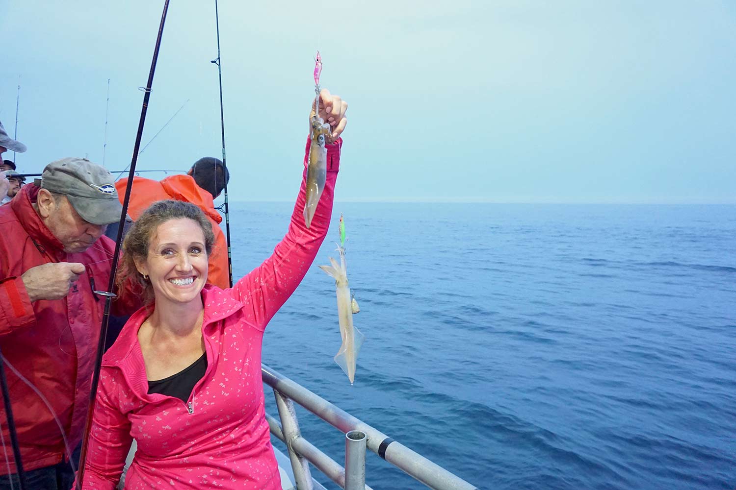 As she was explaining this, Amy hooked into another one and handed me her rod, “Here you reel this one in, and I’ll try out your rig to see if you’re using the right lures.” I reeled slowly, and a small squid came to the surface. Luckily it inked in the water as it came up. I barely got it over the rail before Amy was on another one with my rod. She handed it back to me, and I realized there’s a lot more to squid fishing than I thought.