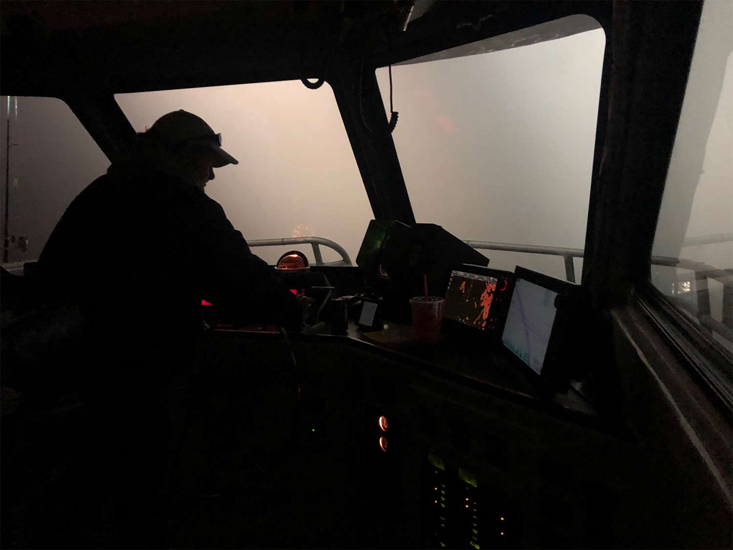 On the way back, Steve volunteered to do the scrubbing. The fog returned with a vengeance, and although there weren’t as many boats to dodge as before, it was still a slow ride. I stood on the bridge with the captain and spoke with him while one of the customer’s kids slept on the bench behind us.