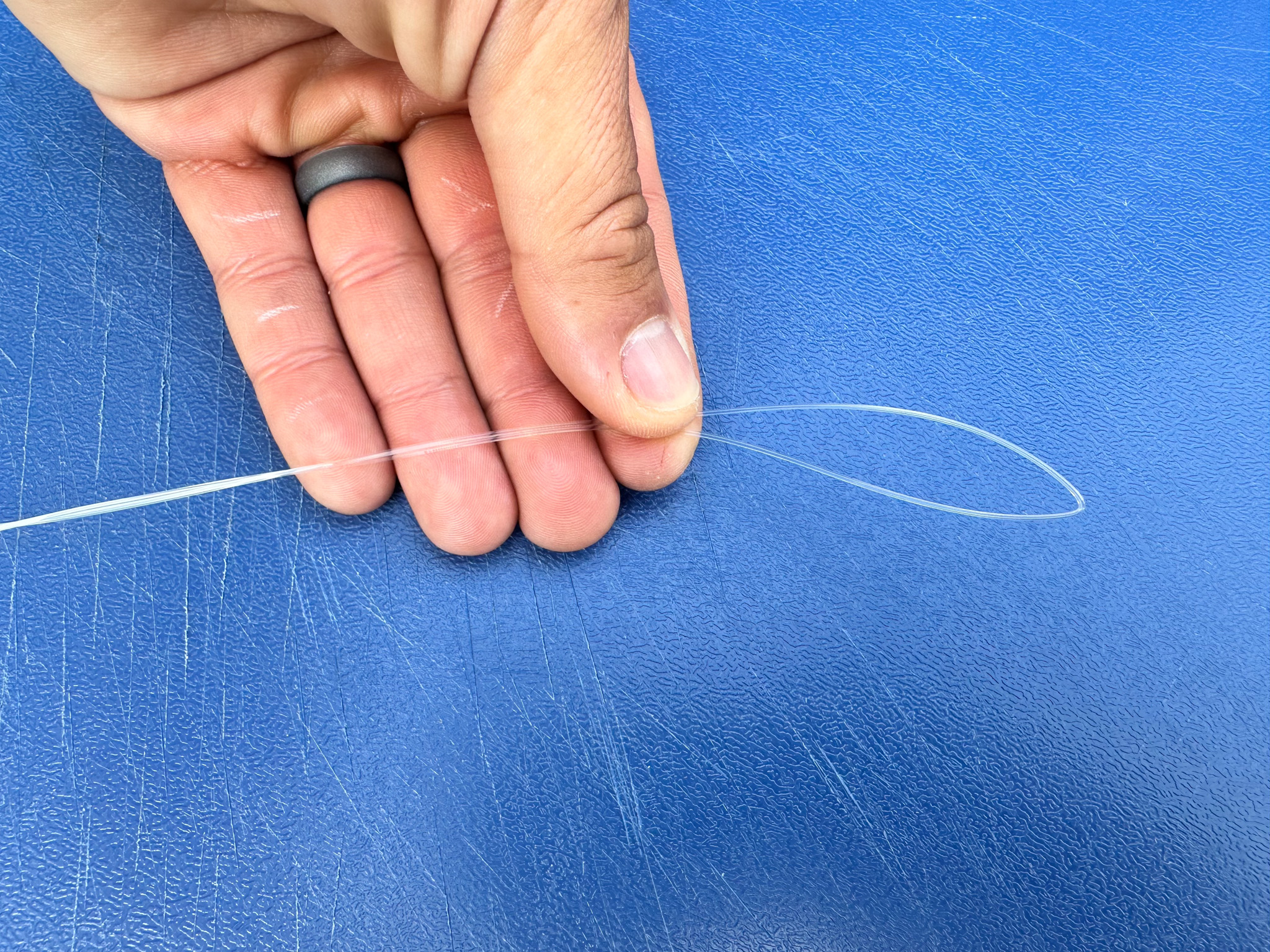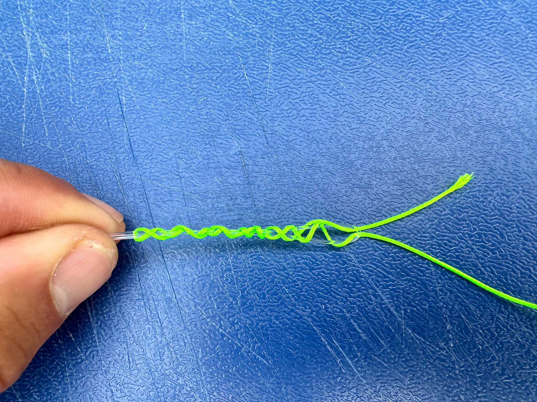 3. Now, wrap the braid around the doubled leader seven times, moving away from the end of the leader. After the seventh wrap, pinch the wraps in place.
