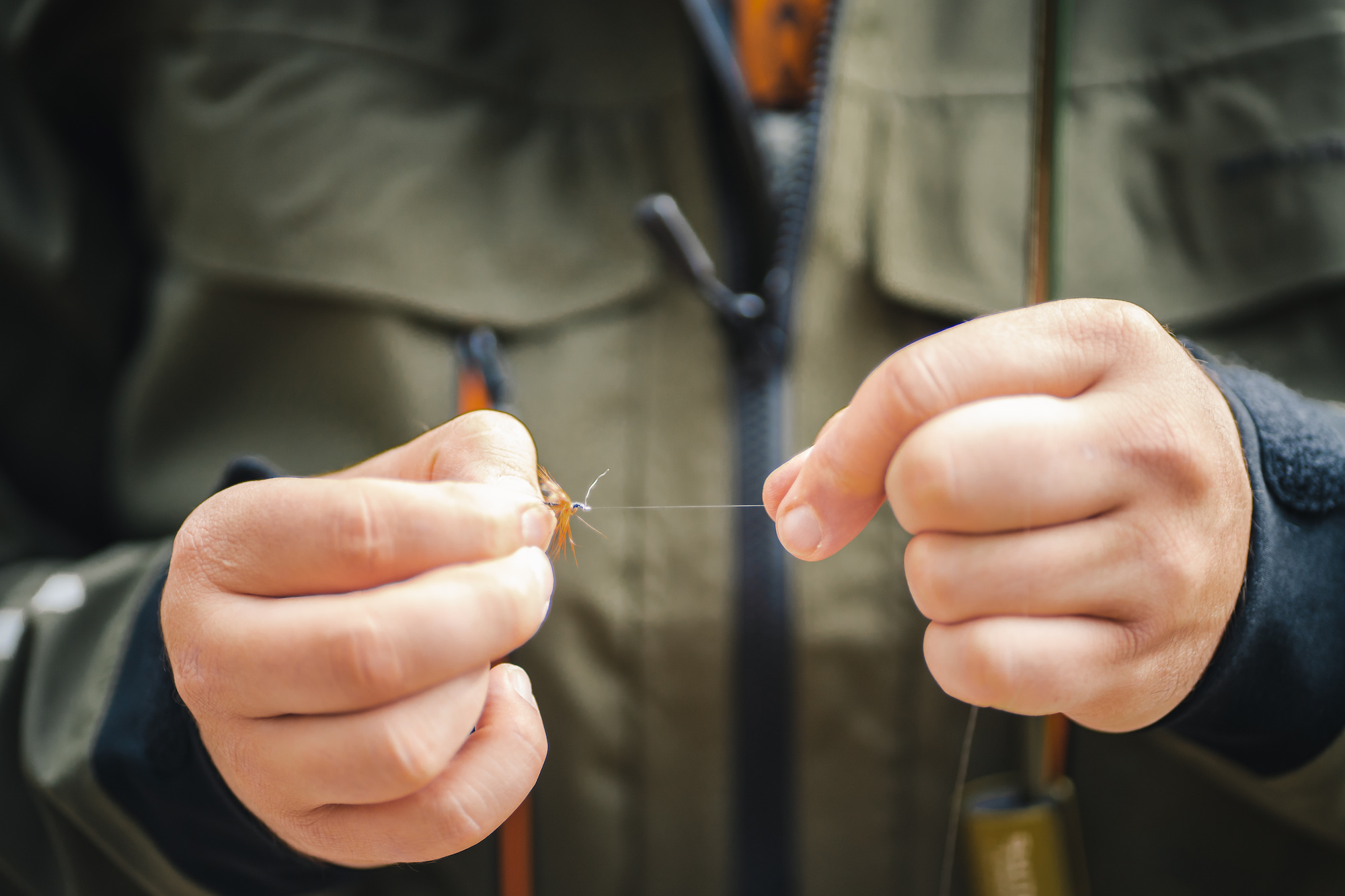 Every presentation requires the two hands to be in sync: the dominant hand guides the rod, while the off hand controls the line. As soon as the fly hits the water, you want to pass the fly line through the trigger finger of your rod hand. You can then use your off hand to pull the line through the small gap between your trigger finger and the cork rod handle. This is known as “stripping” line.