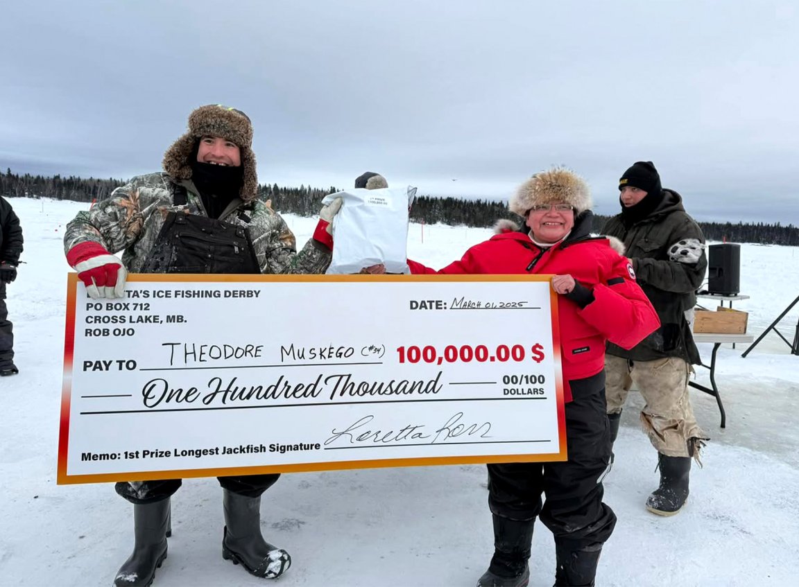 Among the 500 anglers participating in a Manitoba ice-fishing derby last weekend were Theodore Muskego and his dad Glenn. They’d driven 500 miles to Cross Lake from their homes near the Alberta-Saskatchewan border to compete. The local tournament, hosted by Loretta’s Burgerstand, offered a $100,000 top prize for the largest fish caught.