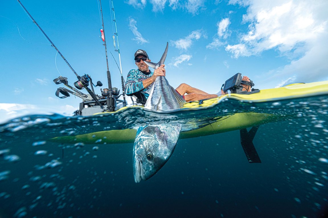 “Set it! Set it!” he howls, still fighting his fish. I set the hook with everything I’ve got, and despite the light drag and the give of the kayak, the yellowfin pulls me guitar-string-tight and spins the nose of my boat. Then we see Clinton’s fish thrashing to the surface between us. The exhausted yellowfin comes up sideways, floating like a lost lifeguard float. It’s every bit of 30 pounds, maybe more.
