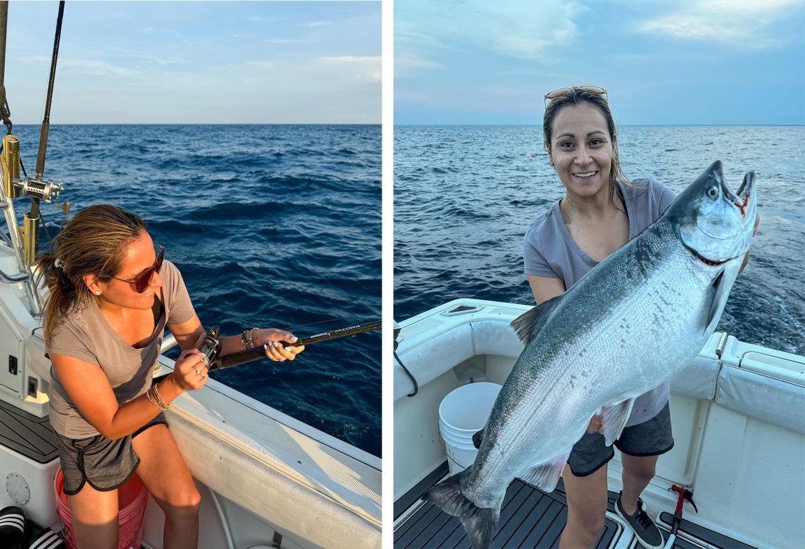 “It was a big one, and when she got it close to the boat, Kyle thought it was a nice king salmon,” Nick says. “But when he netted it, he saw it was a massive coho, which are usually much smaller than kings. It’s the biggest coho we’ve ever seen, and it was just shy of the Illinois record coho caught in 1972.”