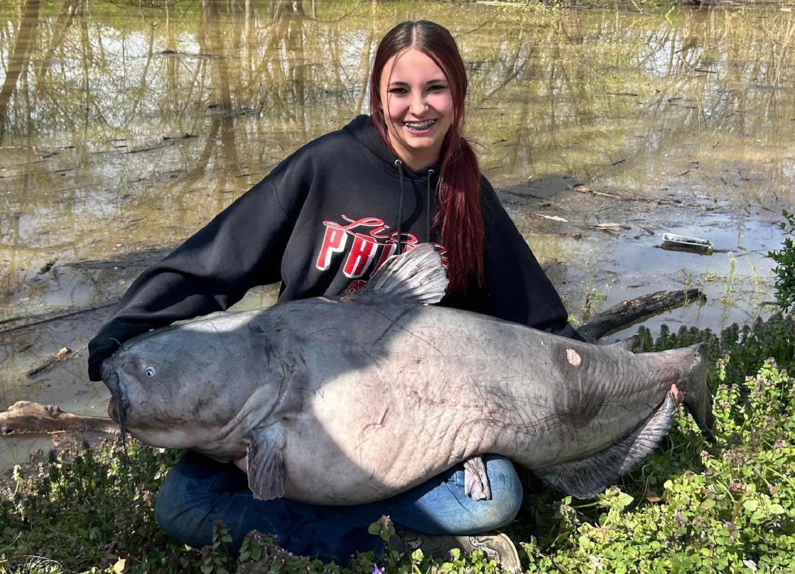 April 15, 2024: On April 7, 15-year-old Jaylynn Parker of New Richmond, Ohio pulled in a 101-pound, 56-inch blue catfish on a jugline from a creek behind a family friend’s house. The Outdoor Writers of Ohio, a non-governmental organization of outdoor media professionals that maintains the state’s fish record database, is currently deciding whether to name the fish as the formal state record.