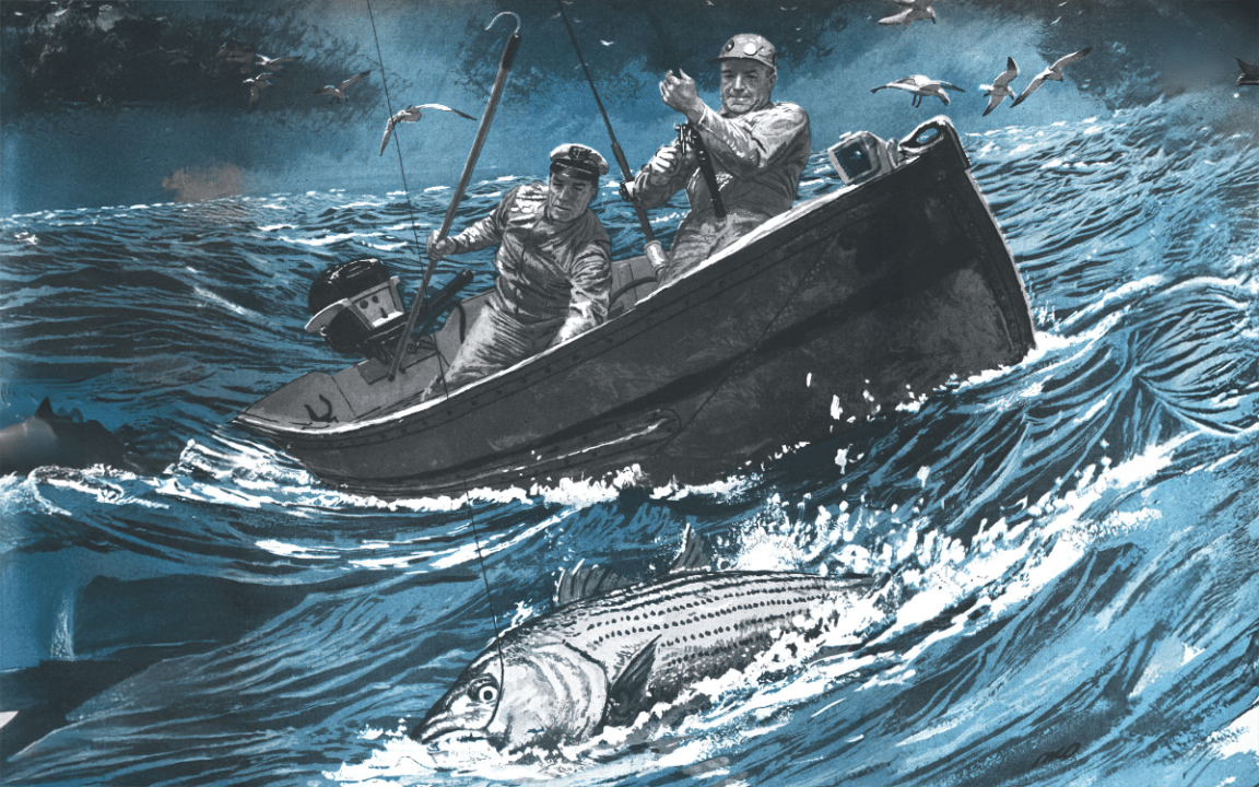 The wind was whistling and our boat went scudding along. Ralph was eating a shredded cigarette as the berserk monster kept stripping line off the spool. He finally turned the fish and brought it back, pumping steadily. His medium-weight surf rod was bent almost double, and I remember thinking that the power of the striper and the force of the wind might combine to produce a sticky situation. I waited, gaff in hand.