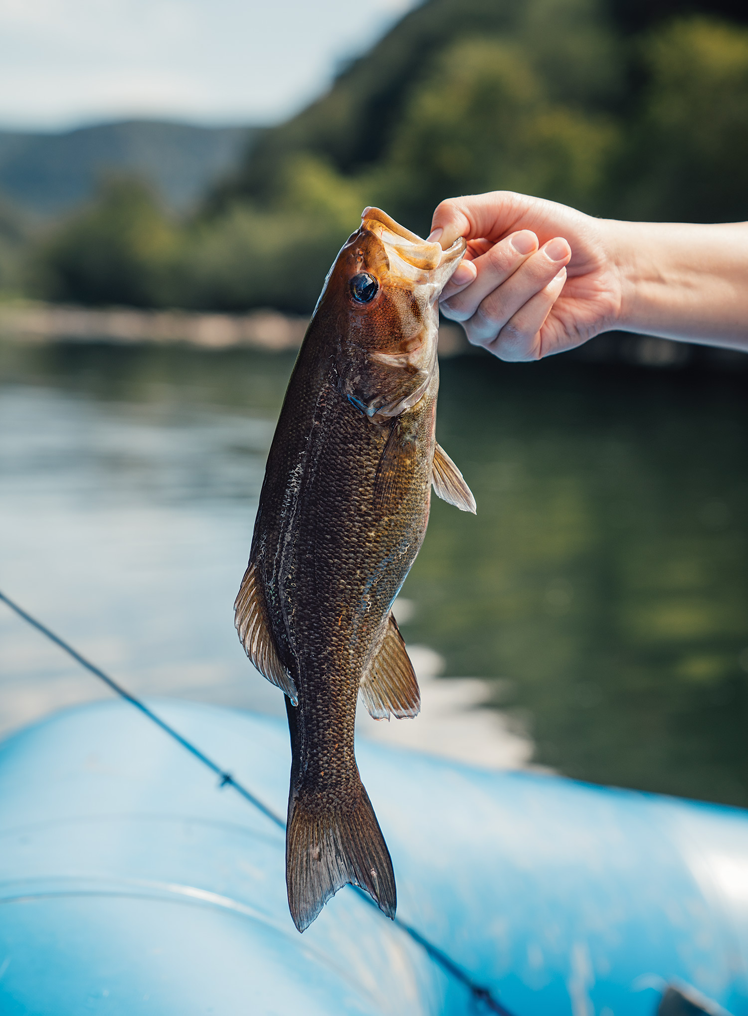 We don’t see other boaters until the last day, as we approach the biggest rapids. I assume this final gauntlet will mark the end of our trip (Class IVs and Vs at peak flow). But as we drift toward the takeout that lies just past the soaring steel bridge, a smallie strikes my swimbait. As quickly as I release it and cast into another riffle, there’s another bite. Soon I’m catching fish on nearly every throw: small ones, each as feisty as the last. I scramble to release each so I can catch the next, all while playing keep-away with Otter, who’s as fond of fish as his namesake. Simon rows to a rock just under the surface and climbs out. He leans into the current, holding the raft so I can keep fishing. At last we have to call it and give in to the pull of the river.