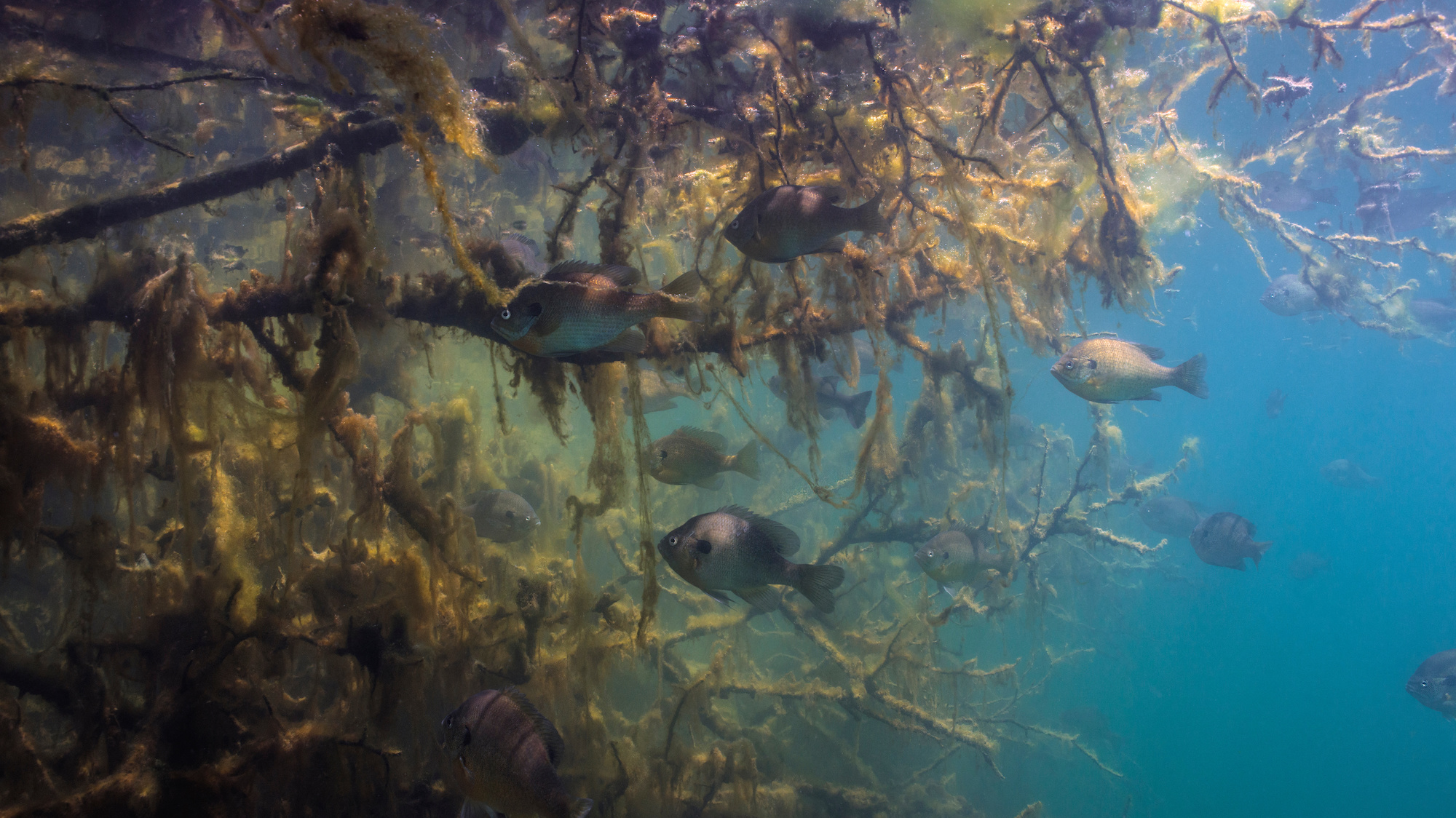 They prefer areas with lots of aquatic vegetation, and are often found near logs, weed beds, or some other structure (both natural and manmade). Bluegills typically inhabit deeper water, where they tend to congregate in schools. They’re also territorial, and will typically stay within a 300 to 400 square foot area for most of their lives.
