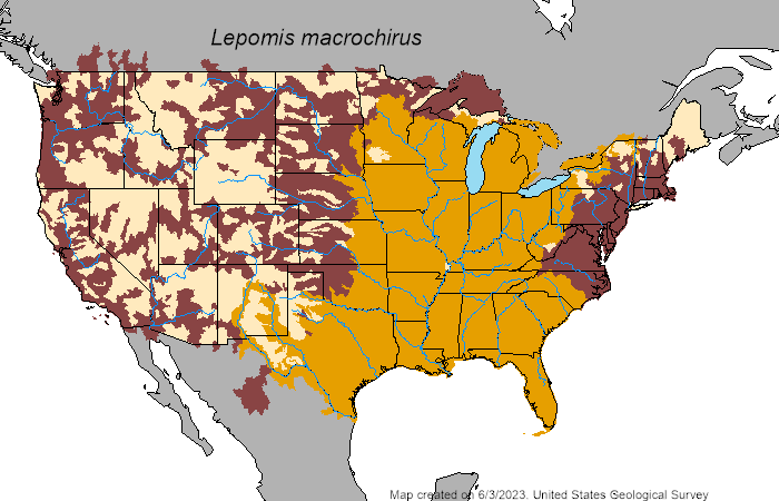 Bluegills historically occupied a native range that covered most of the Eastern and Central United States. This included the St. Lawrence-Great Lakes and Mississippi River Basins—stretching from Quebec and New York to Minnesota and then south to the Gulf of Mexico—as well as the entire southeast region from Virginia’s Cape Fear River to the Rio Grande in Texas and New Mexico.