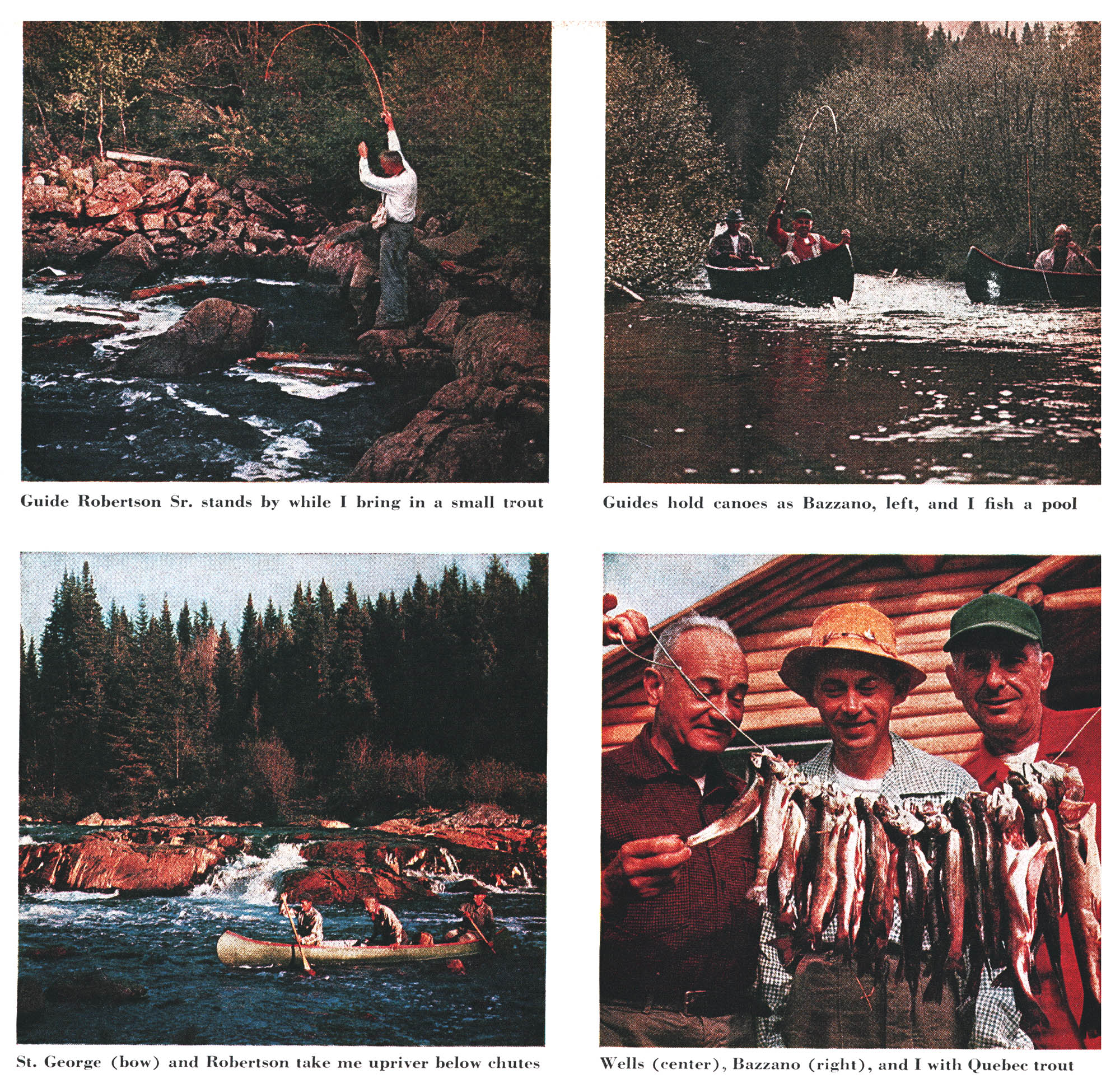 We had a good breakfast at Henry’s, then piled into his station wagon and bumped 28 miles down a lumber road to the landing across from the chutes known as St. Henri’s Falls. Across a mile or more of water, the chutes was a white gash against dark-green forest. Our four guides — St. George, Robertson, and their two sons — were at the landing, and soon we were a fourcanoe flotilla, powered by a 5½-horsepower motor, headed for the chutes.