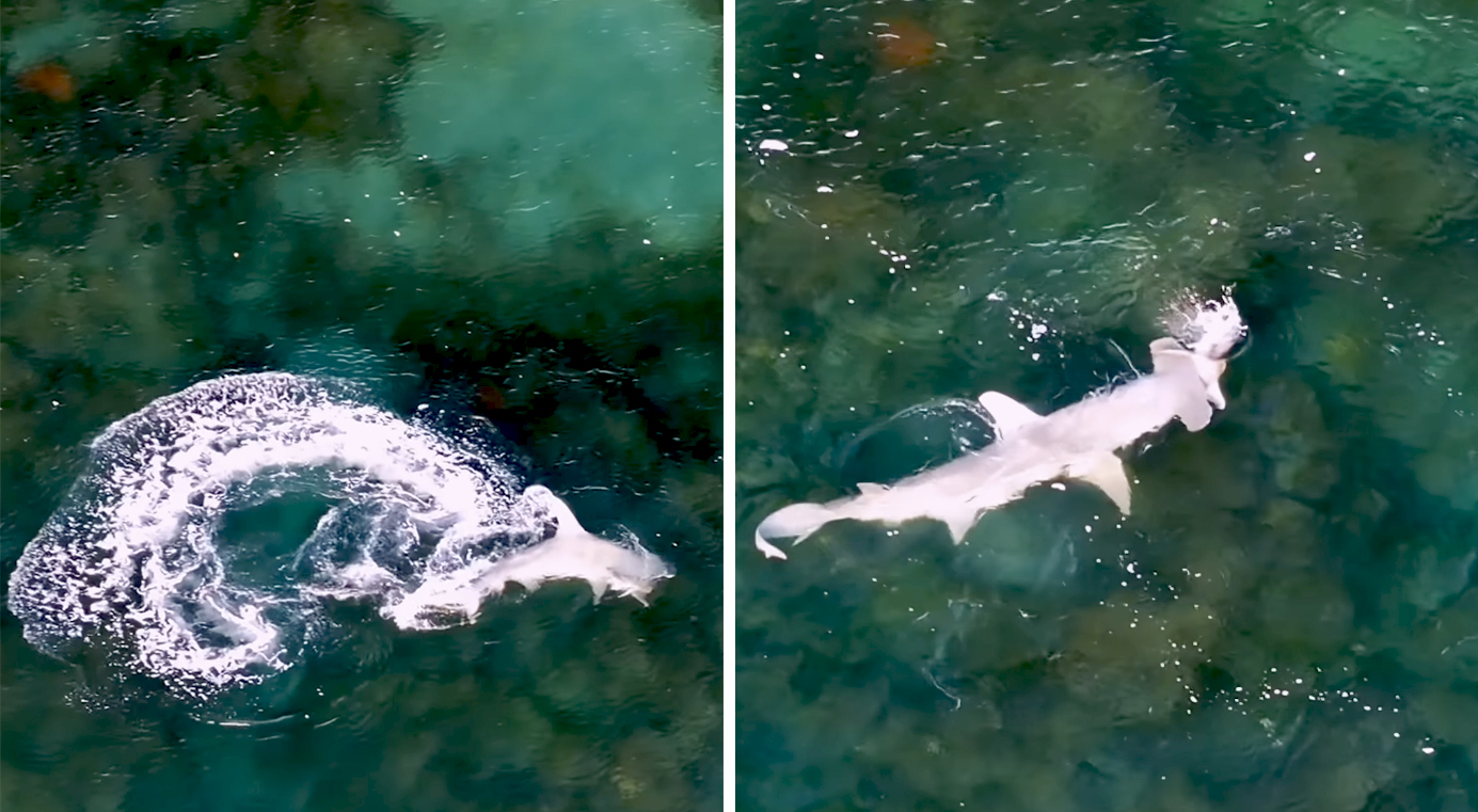 At a distance, Wil initially thought all the splashing was produced by dolphins chasing fish. When she piloted the drone closer, however, she realized, “that’s a big f*cking shark!”