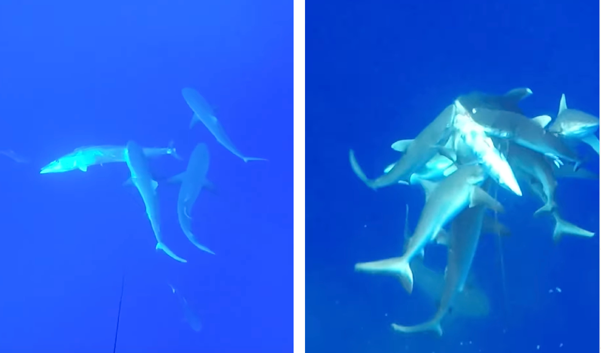 Pretty soon even more sharks swim into the frame and circle the carcass, which is now surrounded by a cloud of its own shredded flesh. It’s hard to tell how many sharks are actually present, but between three and nine feed on the wahoo at any given time throughout the video.