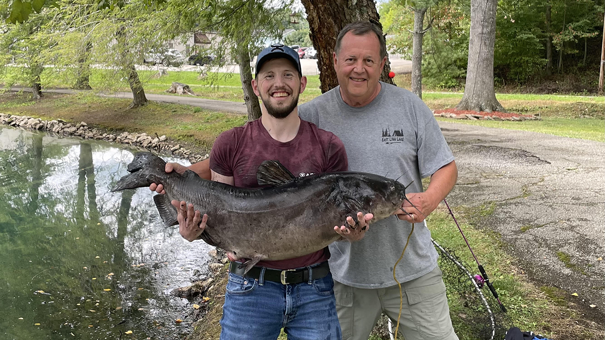West Virginia Department of Natural Resources biologist Jeff Hansbarger and assistant fishery biologist Jake Whalen traveled to the small farm pond to weigh and measure Rutherford’s catch. Rutherford had already put a stringer through the catfish’s mouth and he held it in deep water until they arrived.