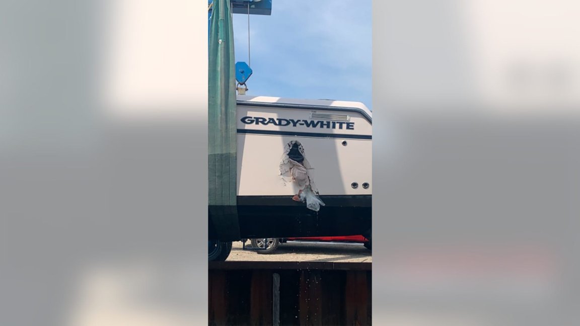 The fisherman who fell out of the boat upon the impact said he landed on top of a whale. When the anglers helped their friend climb back into the boat, they realized they were taking on water.