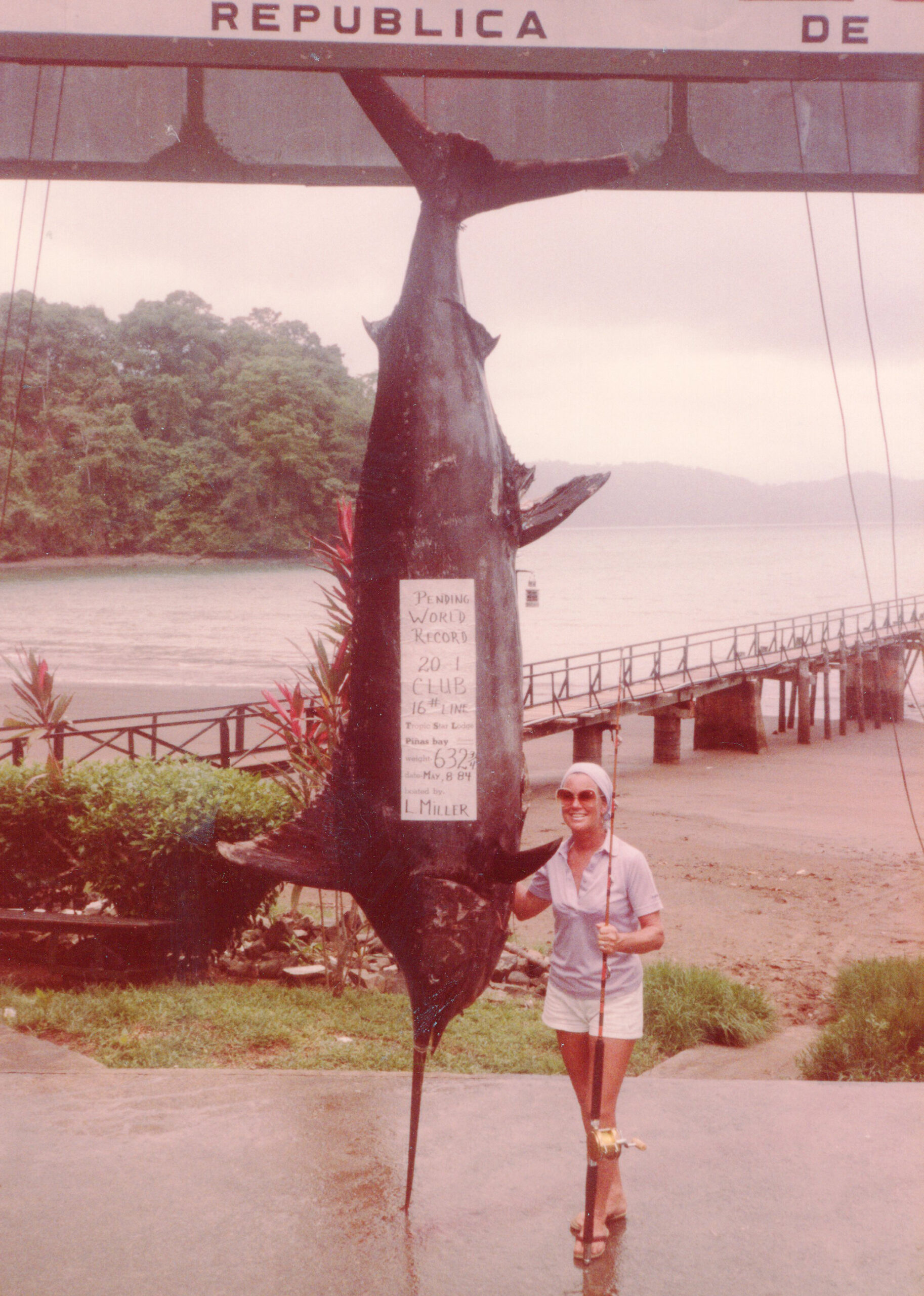 The women’s 16-pound line class record is held by Linda Miller, who caught her 632-pound, 12-ounce marlin on May 8, 1984, fishing off Piñas Bay, Panama. Miller was using a Sabre rod and Penn International 20 reel spooled with 16-pound Amalon T line. She was trolling a bonito. The marlin was 120 inches long with a 66-inch girth.