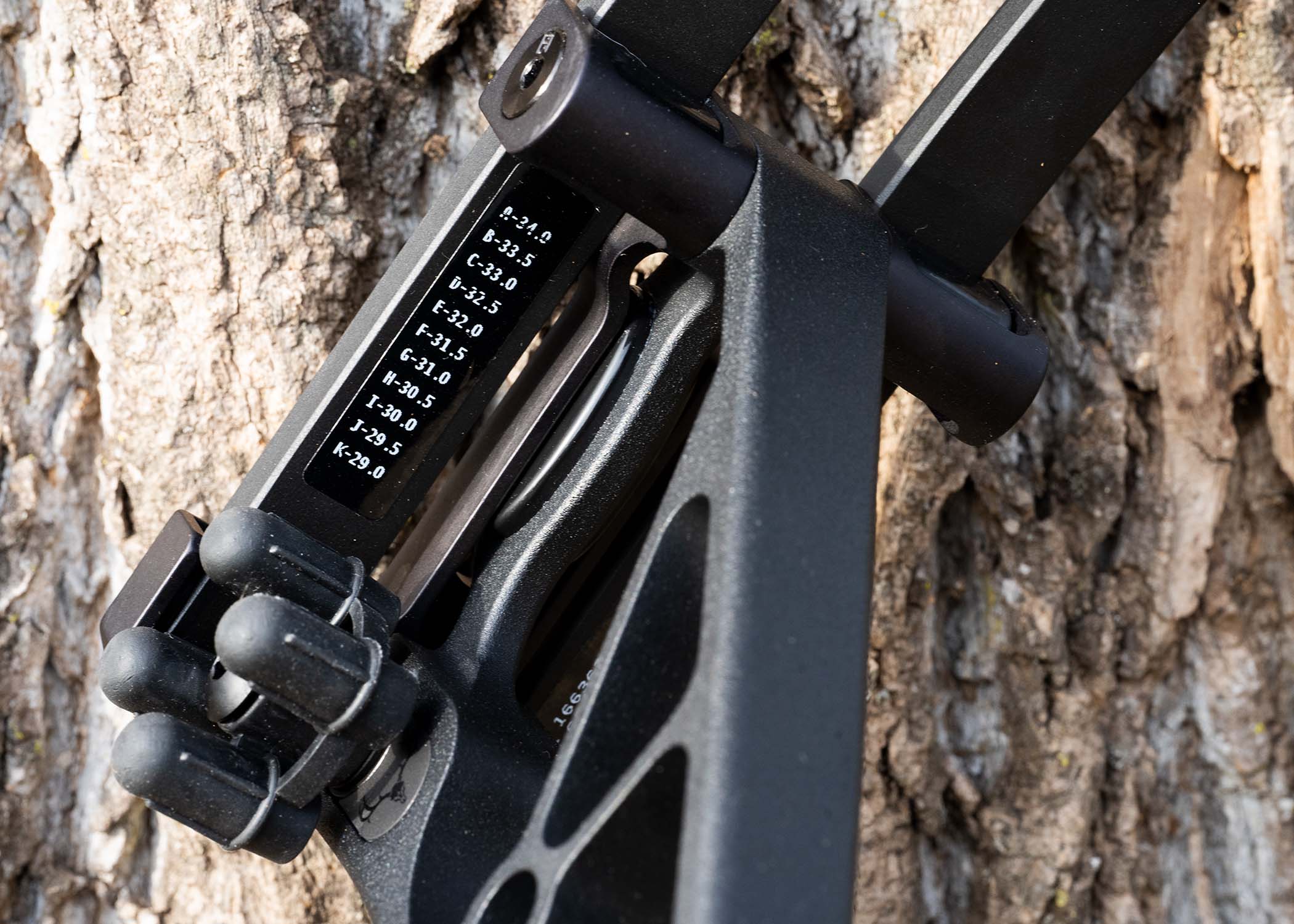 Measuring a bow’s exact draw length on a draw board provides context for speed and tests if the bow is hitting its specified draw length. We set bows at 29 inches of draw length and measured the draw length using the ATA standard of the string apex to the pivot point plus 1.75 inches.