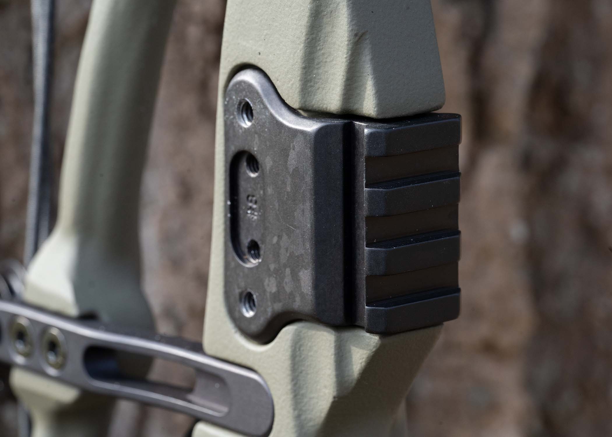 The Ventum Pro 33 has the lighter HBX Pro cams, which have been shifted for a better sight picture and vane clearance. There’s a Picatinny rail machined into the riser for attaching Pic-mounted sights. There’s also the Integrate arrow rest mount and the bow is compatible with low-profile quivers (low-profile setups are a trend with many of the flagship bows this year). Hoyt reduced the grip angle by 4 degrees for a lower wrist and, in my opinion, a more comfortable grip.
