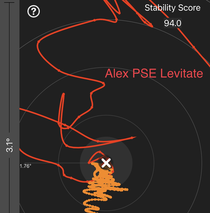Above, you’ll see Robinson’s Mantis reading. His pin float was extremely tight and predictable (that’s indicated by the orange line wiggling back and forth up to the target). On the release there was almost no bow movement—the two Xs are stacked right on top of each other. He achieved a stability score of 94 with a bow that weighs 4 pounds. That stability score is nipping at the heels of what pro archers achieve with fully rigged target setups.
