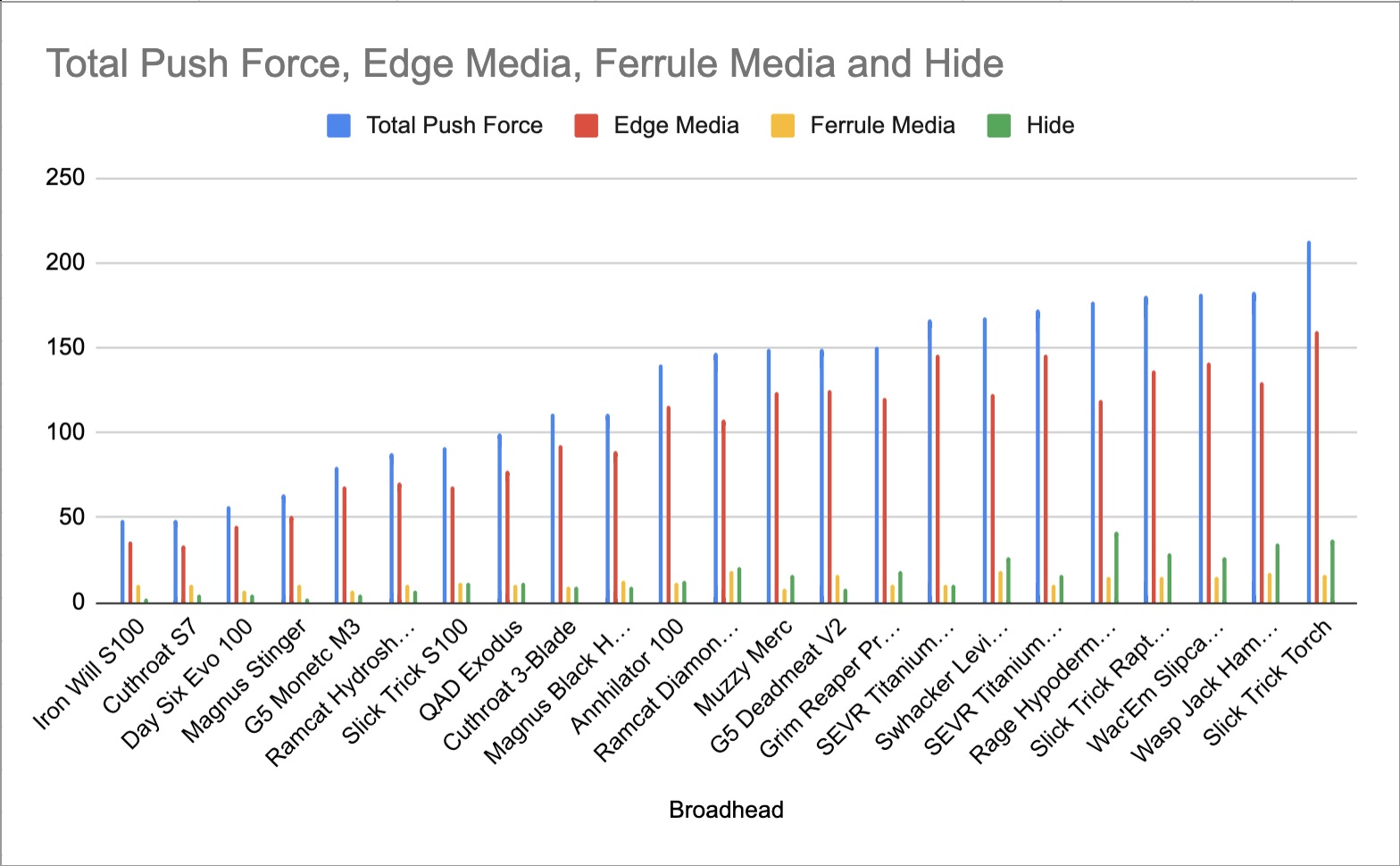 If you asked me before the test what would cause a broadhead to penetrate poorly, I would say cutting width. One of the most important tests conducted was the push force test, which measured the amount of force required to push a broadhead through different media. In the push force test, we saw several wide cutting heads penetrate better than narrow ones. This was obvious in the best penetrating mechanical versus the worst penetrating fixed blade. The Ramcat Diamondback Hybrid, a 2-inch mechanical, had a push force total of 146.75 pounds and the Muzzy Merc, a 1 ⅛-inch wide 3-blade, had a push force of 149.1 pounds.