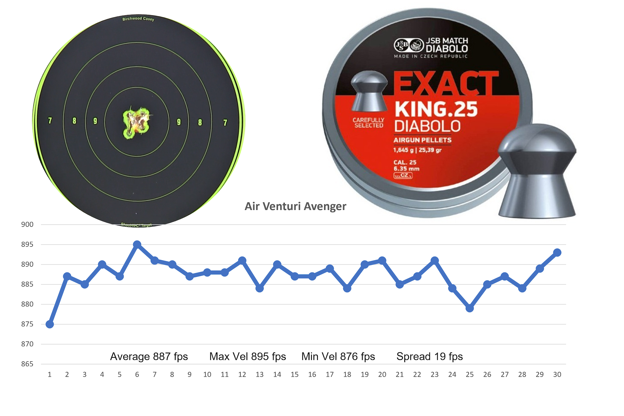 I’ll start off with a bit of a disclaimer, these results were obtained from my Avenger in .25 caliber with my individualized setup. I dialed in my preferences with respect to power output, consistency, and shot count, your results will probably be different depending on how you set up the rifle. With that said, let’s take a quick look at my results. Generating an average velocity of 887 fps over a thirty-shot string, using 25.39-grain JSB King Heavy Diabolo pellets, my Avenger produced power of approximately 45 ft-lb. There was only a 19-fps spread over the string, which is outstanding consistency. This is reflected in the accuracy of the target shown in the above photo, which is a 16-shot group at 40 yards.
