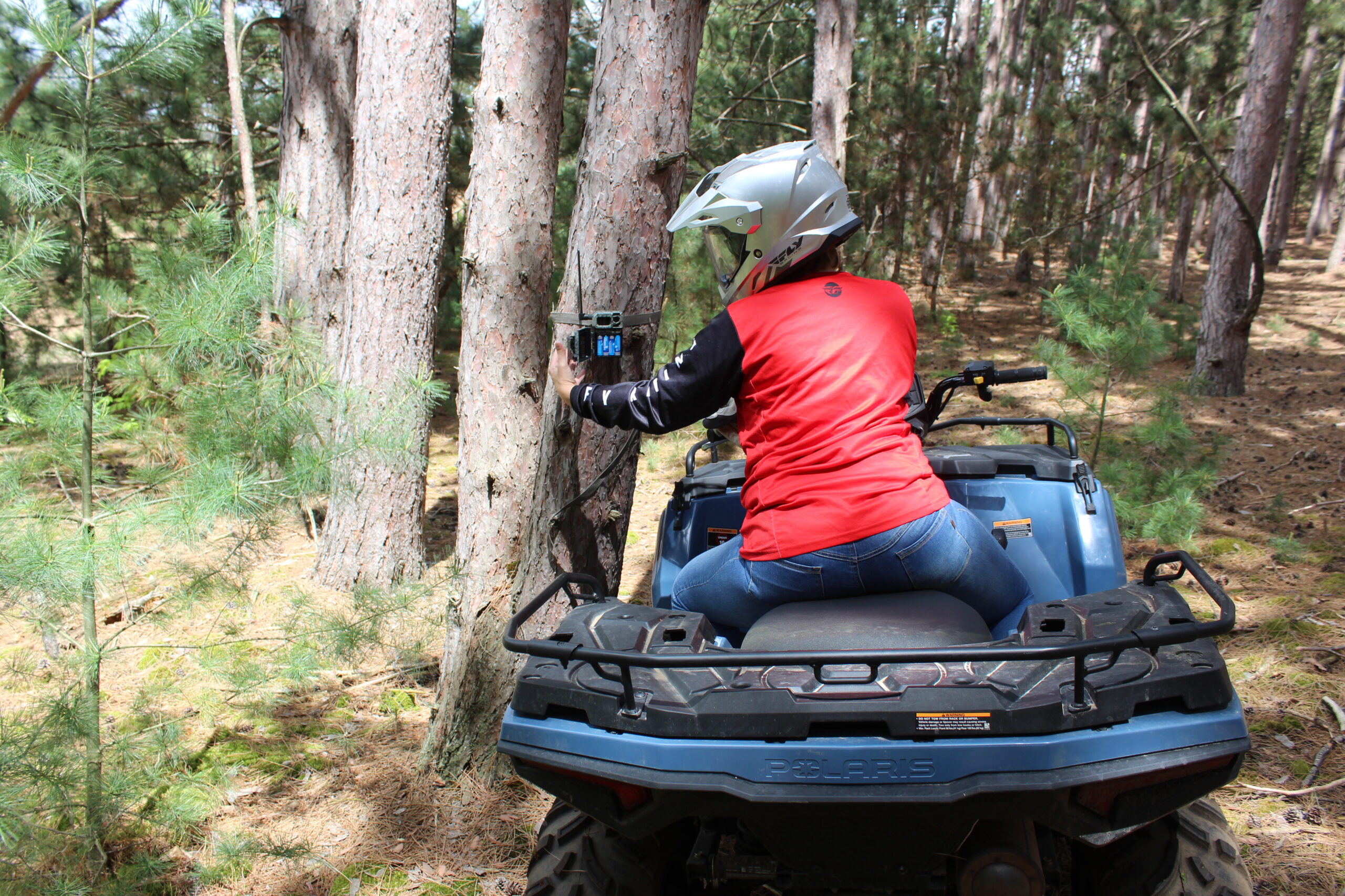 With the Sportsman’s 48-inch overall width, it’s easy to navigate through the woods. If you see some signs of deer activity, you can stop and pop a camera onto a tree and never even have to get off the machine. My husband likes to give me shit about it, but I can quickly put up more cameras than he can, and my Michigan deer was bigger than his last season.
