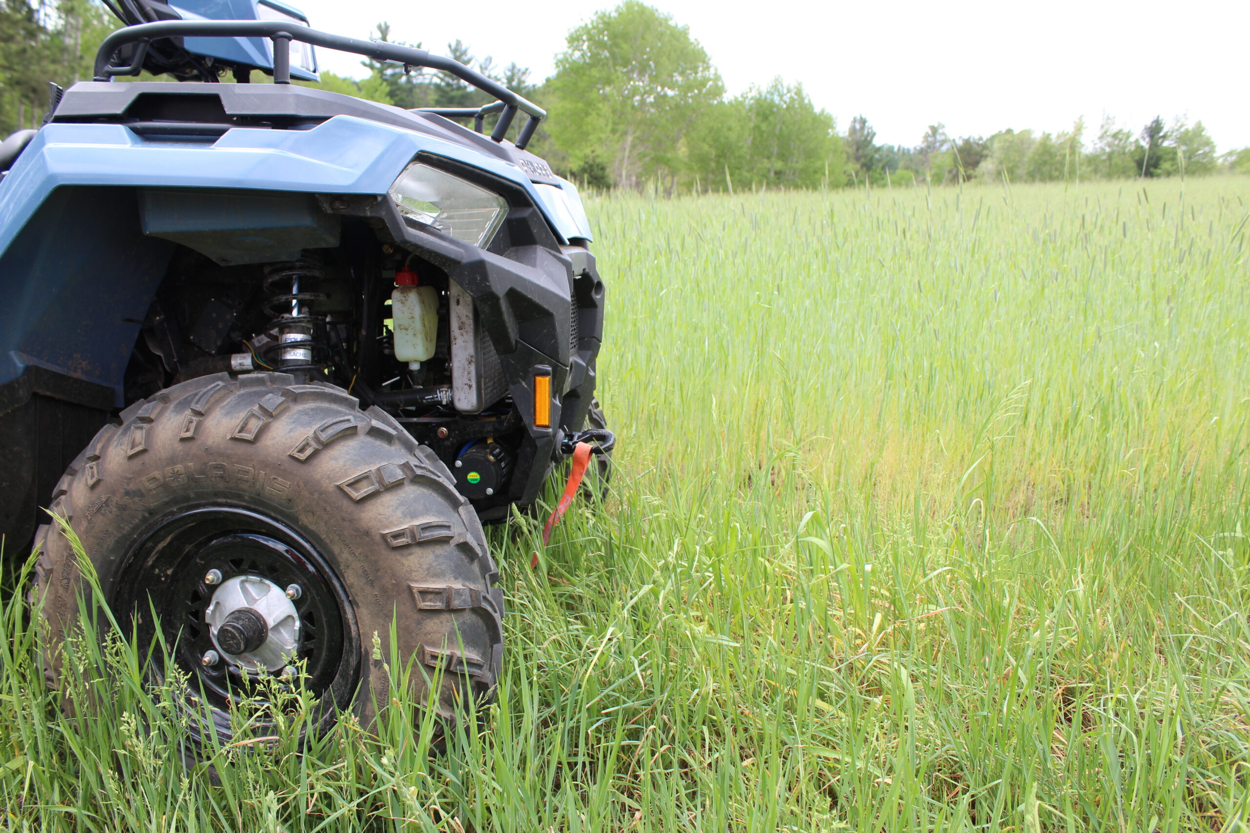 The tires are okay for hard surfaces. They are 25-inch P373 Polaris tires on 12-inch wheels, with a 6-ply construction. They are tough and get decent traction on roads, but they’re not very good in the snow and mud. Plowing snow quickly made me realize that the 450 needed an aftermarket tire upgrade. I know from talking to our local dealership that the first thing most people do when they buy an ATV or UTV is switch the tires to something that better suits their needs. We have a set of Sedona Bucksnort tires on our personal ATV, and they perform much better than the Polaris stock tires.