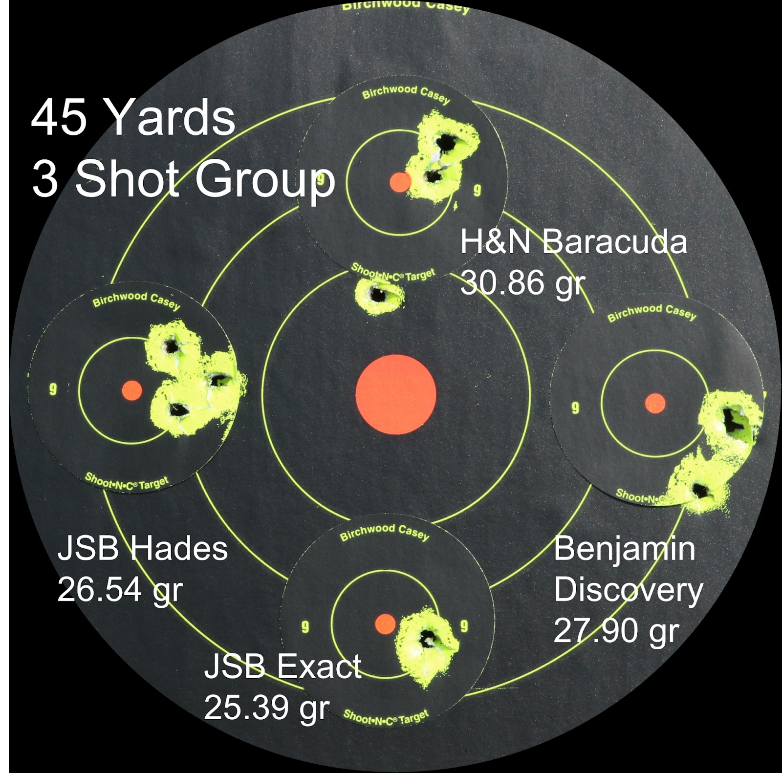 In my range session, I shot four different pellets, the JSB Exacts, the Benjamin Discovery, the H&N Baracuda, and the JSB Hades. The JSB Exacts gave the best results, and an occasional flyer occurred with the H&N’s, but all of these pellets would be good for small game hunting. Even the best air rifles can have pellet preferences, so to get the best possible results, the shooter needs to try different projectiles.