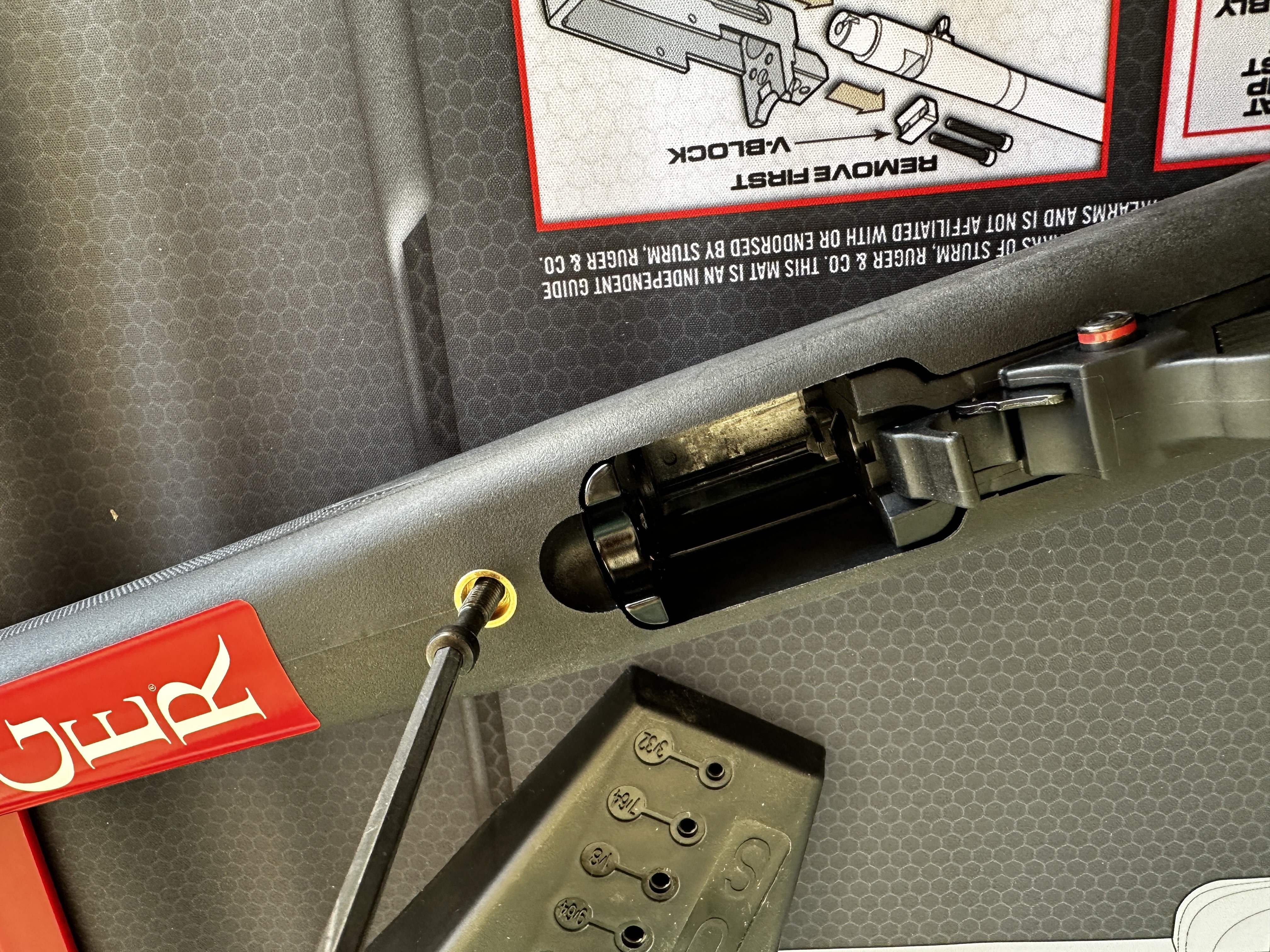 Adding a new stock to a 10/22 is as simple as it gets. Just loosen the two screws that hold the action and original stock together and drop it into the upgrade. (Though you might have to take off the barrel band on some 10/22s too, which is one tiny additional step.)