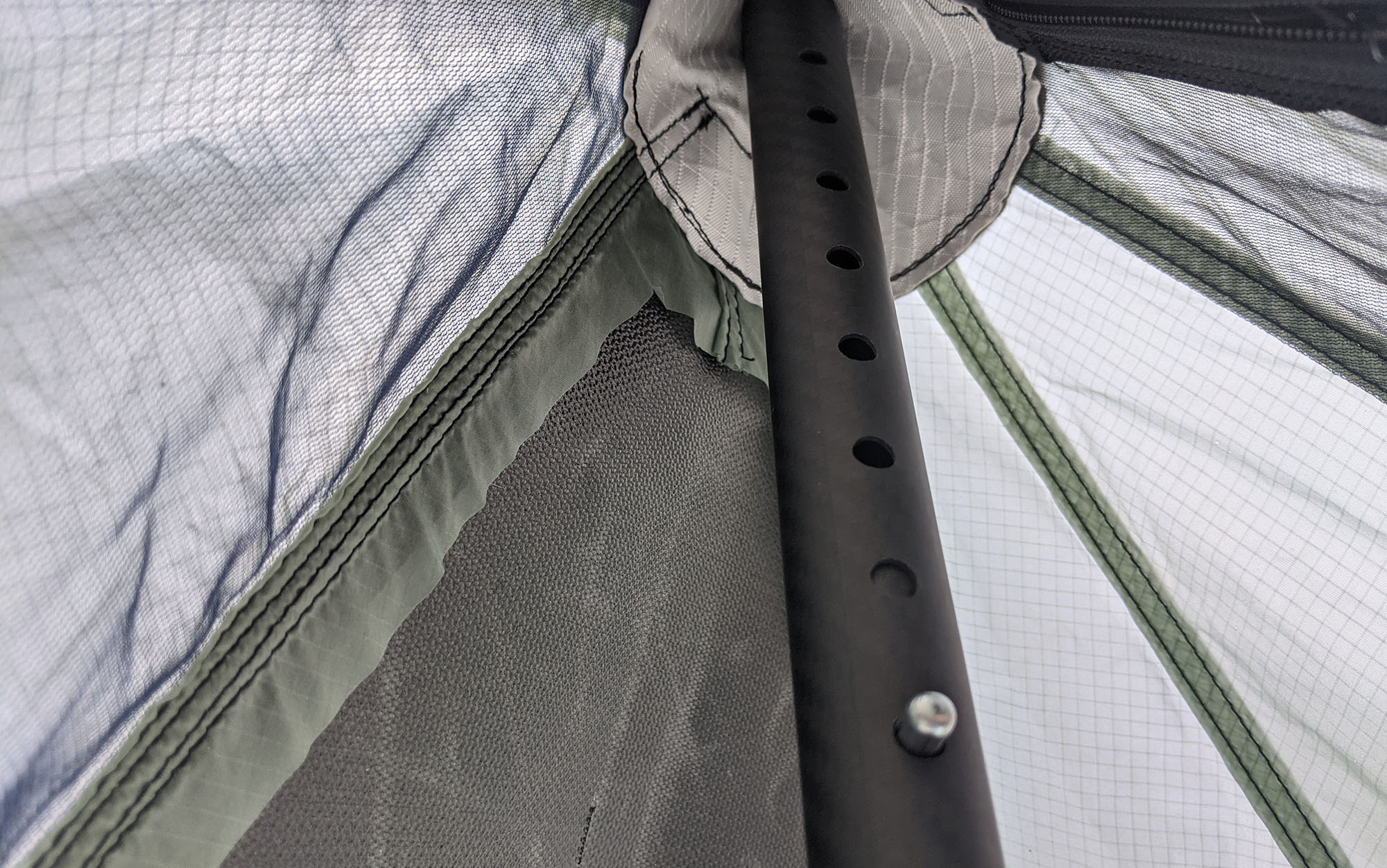Once your stakes are in the ground, it’s just a matter of assembling the meaty but lightweight carbon fiber pole and extending it upward into the top corner of the tent. Once it’s in place, you can use the additional holes on the top section of the pole to extend it higher up, increasing the tension on the fabric body of the tent. While I recommend watching the accompanying video showing how this works on Seek Outside’s website, in practice it’s more straightforward than one might expect.