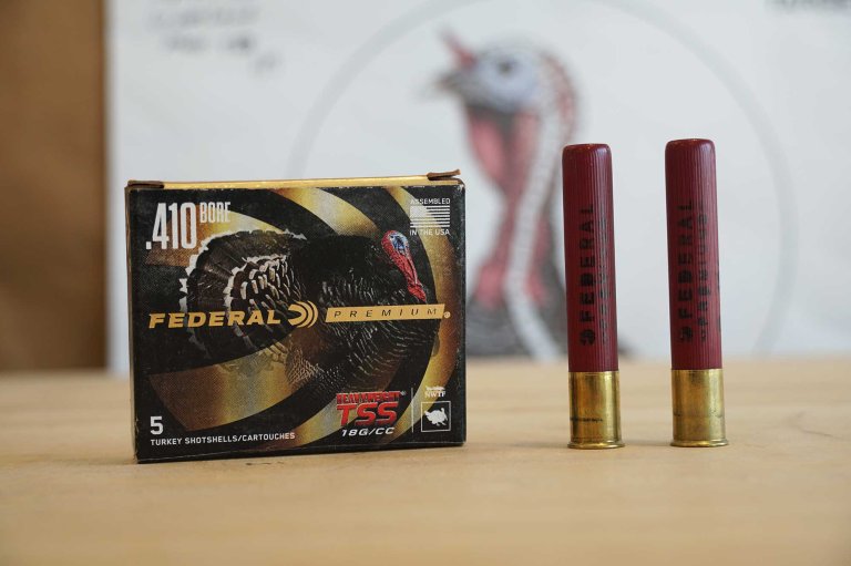 The best turkey load is one that patterns well through your gun and choke combination. Ammo for turkey hunting generally has a higher payload because pattern density is so critical (you need a lot of pellets in a small area to ensure head and neck hits). In terms of .410 ammo, payloads are typically either 13/16 ounces or ⅞ ounces.