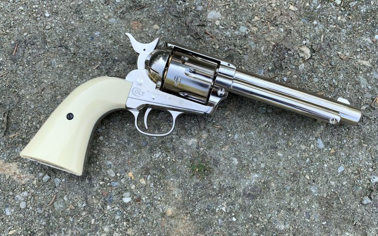 Another realistic western-style BB gun is the Colt Peacemaker from Umarex. This gun is mostly metal, with plastic grip scales, and is a great replica of the classic Colt single action revolver. It’s got a stainless finish and true-to-form single-action operation. This revolver uses the same steel cartridges that the Cowboy Rifle uses, in which the BBs are pressed into the case head. I found it to be a ridiculously cool six-shooter that feels just like the genuine article.