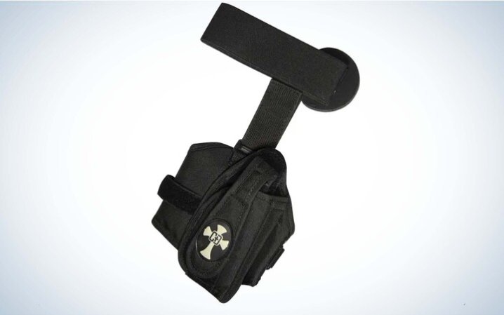 The Crossbreed ankle holster is a somewhat adjustable and secure-fitting ankle holster that’s held up by both above-calf and below-calf straps. The vertical strap that connects the holster to the above-calf neoprene strap is adjustable for height, so that you can fine tune your carry position. An above-calf strap will help prevent your holster from sliding down too low, and keep it hidden in the slack of your pant leg. The holster itself is nylon, and the pistol is secured with a single retention strap that folds over the top of the gun and attaches via hook and loop to the holster. To remove the gun, you’ll have to pull up on the strap before drawing. This isn’t as streamlined as a thumb-break strap, but if you’re already having to bend down and hike up your pant leg, it’s not a big deal.