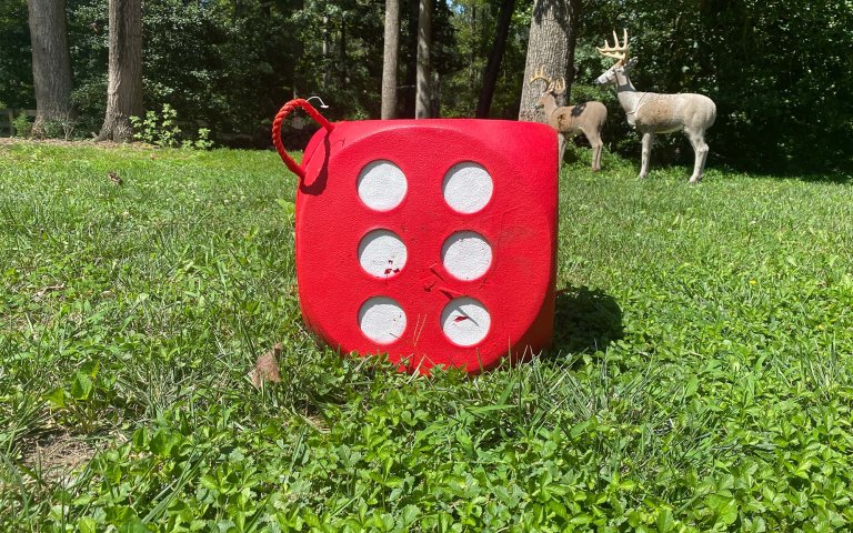 The High Roller foam is much softer than any target that I’ve owned, which contributes to the ease of arrow removal. Arrow removal is even easier than the Rinehart RhinoBlock. But, the High Roller doesn’t heal well after being shot with broadheads. I used this target while testing the best broadheads, and just a few shots in the same spot resulted in red slivers coming out with the arrow. To the High Roller’s credit, it took a few hundred shots from fixed and mechanical broadheads without a single arrow coming close to passing through. I think the dice pattern aiming dots are a genius idea. You can rotate the target to shoot five to one aiming spots that are about 3-inches in diameter.