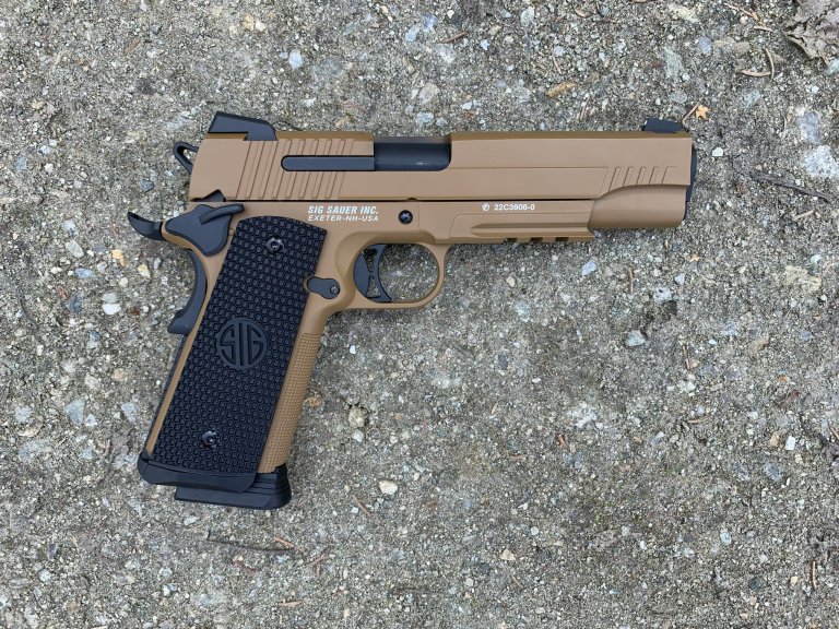 The Emperor Scorpion has a FDE finish, functional thumb and grip safeties, and a very real-looking barrel. It even locks open after the last BB of the magazine is expended. The pistol has good Novak-style white three-dot sights that are adjustable for windage, but not elevation. It shot a great group, but a small point of irritation was that my sights are a bit off on elevation and I can’t do much about it. All-in-all, a pretty solid BB pistol for the price.