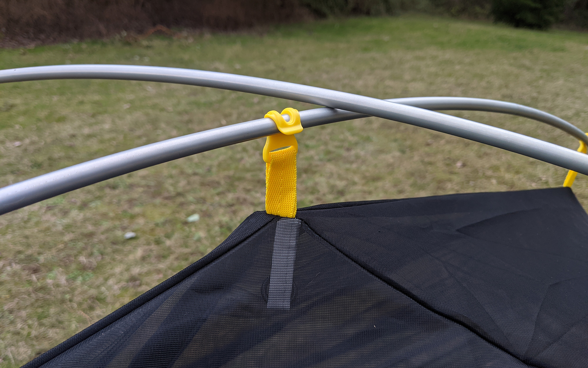 There are several notable ways in which the design of the Decathlon Forclaz varies from the other backpacking tents that I looked at. To start, the poles for this tent don’t attach to the tent body, but to the rainfly itself. The body of the tent, which is made entirely from a breathable fabric, rather than mesh, is attached to the underside of the rainfly using simple clips.
