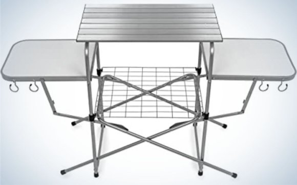 The set-up takes minutes, but the minimalist design has multiple levels for kitchen prep and storage. I used the main slotted aluminum area for my charcoal grill and the two solid aluminum side tables for condiments and food prep. The wire shelf underneath was a nice bonus for picnic essentials, like extra plates and utensils. Four hooks hung and organized my grilling utensils and there was even a spot for drying out my towel.